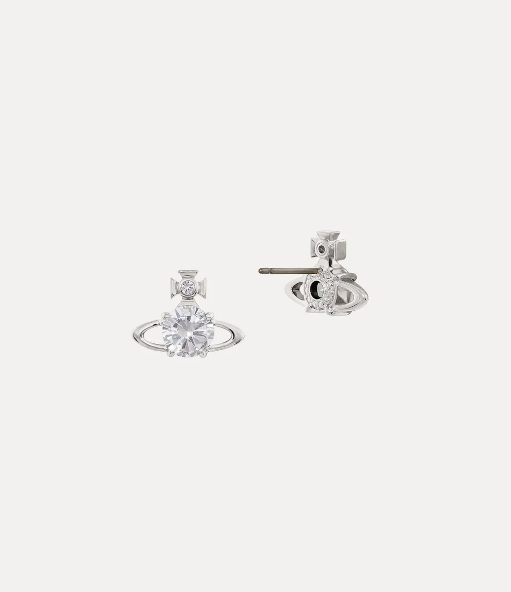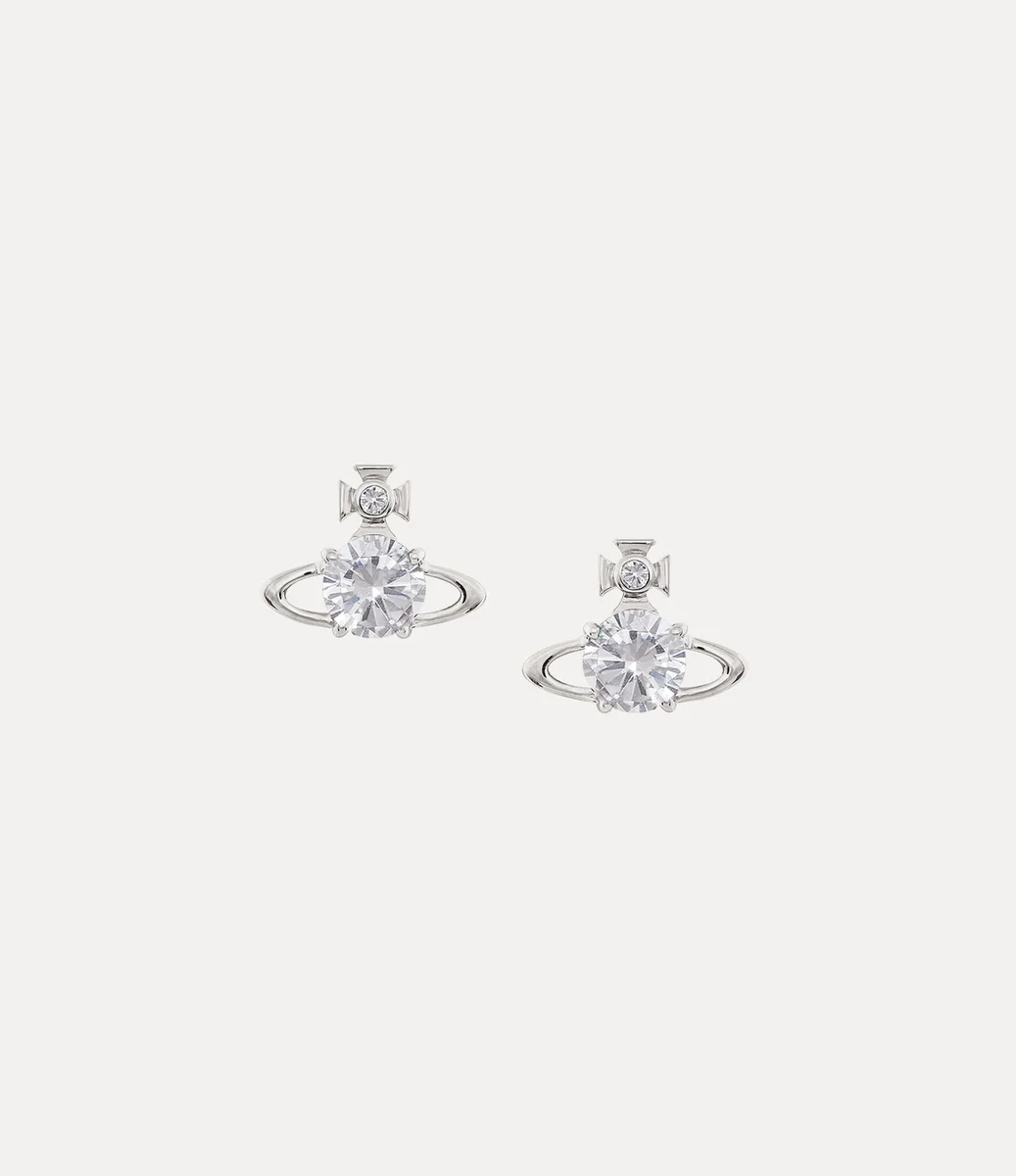 Die silberfarbenen Reina-Ohrringe haben eine kugelförmige Silhouette und verkörpern Viviennes Vision, Tradition und Zukunft zu verbinden. Das zarte Design ist mit glitzernden weißen Kristallen an der Kreuzspitze und in der Mitte verziert und wird mit einem Steckverschluss gesichert.
