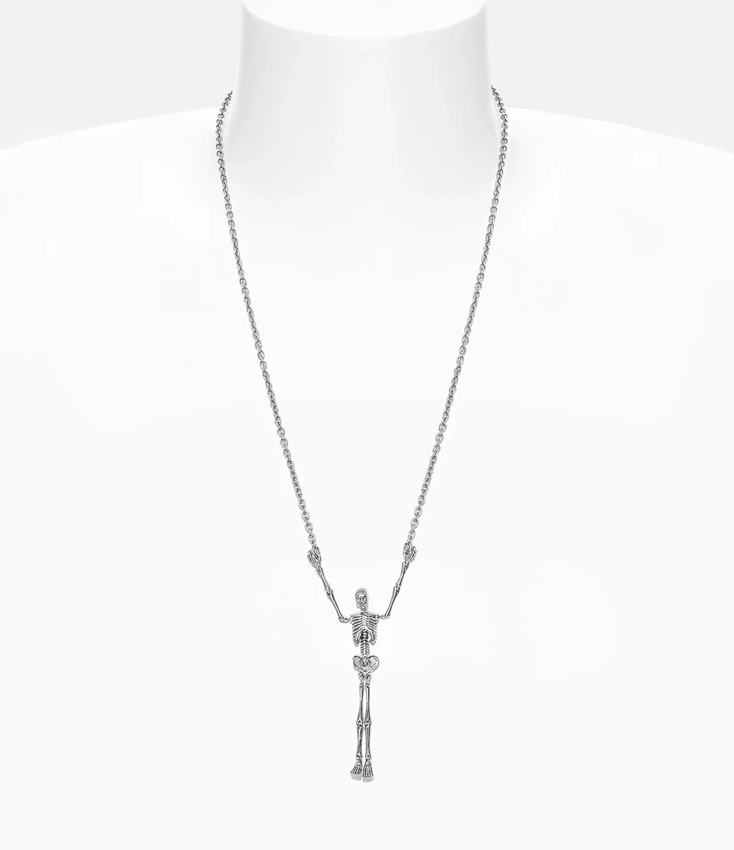 Das Skelettmotiv, das erstmals in unserer Herbst/Winter-Kollektion 1982-1983 „Pirate” vorgestellt wurde, ist zum Synonym für die Punk-Ästhetik des Hauses geworden. Die lange Halskette „Skeleton” zeigt eine Skelettsilhouette mit beweglichen Gelenken und ist in poliertem Silberton gehalten.