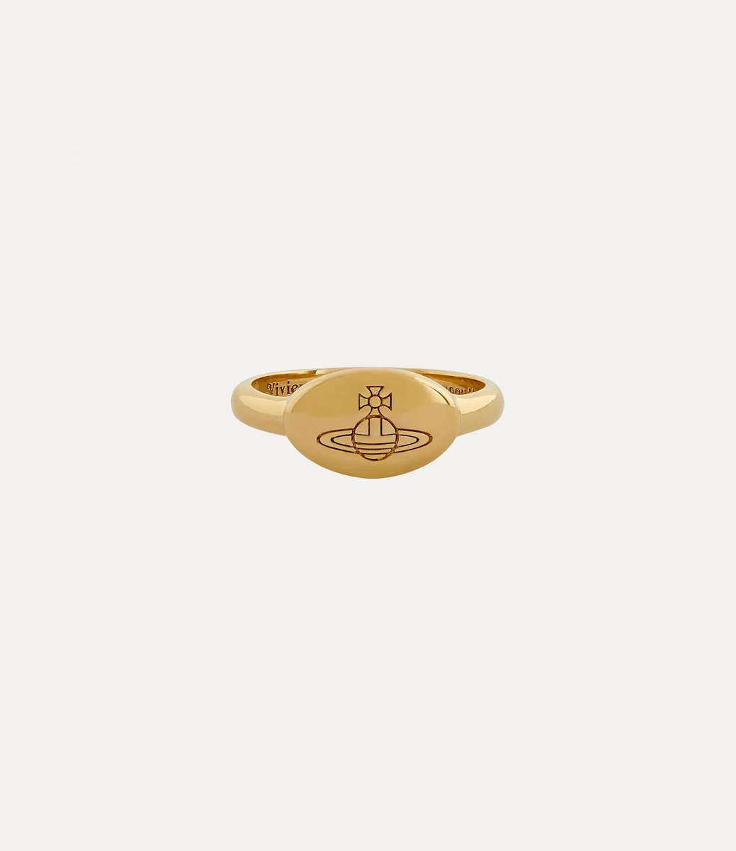 Unser Tilly Ring hat eine klassische Siegelring-Silhouette, ist mit recyceltem Silber veredelt und mit einer goldfarbenen Beschichtung versehen. Dieser Ring von Vivienne Westwood ist mit einer ovalen Fläche verziert, auf der unser charakteristisches Orb-Motiv eingraviert ist. Die Patina unterstreicht die Gesamtästhetik und erinnert an Viviennes Vision, Tradition in die Zukunft zu tragen.