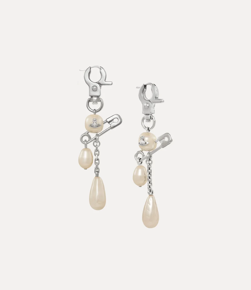 Die silberfarbenen Claude Long Ohrringe sind mit einer Perle in der Mitte des Designs verziert, die mit einem Sicherheitsnadel-Detail versehen ist – eine Anspielung auf Viviennes Punk-Ästhetik. Das Stück hat eine tropfenförmige Silhouette und ist mit einem hardware-inspirierten Verschluss und einem sicheren Scharnierstift versehen.