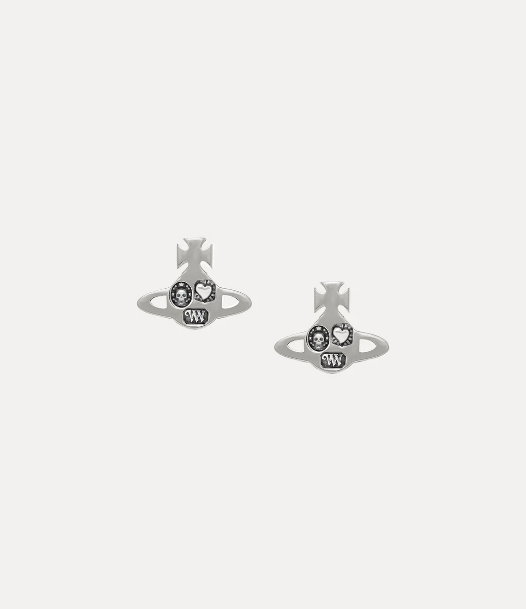 Unsere Crispin Ohrringe sind von traditionellen Punzierungen inspiriert und zeigen in der Mitte eine detailreiche Hausikonografie, die wie in das Design eingeprägt wirkt. Das Stück ist zu einer Kugelform geformt und wird durch eine antik plattierte Oberfläche zusätzlich aufgewertet.