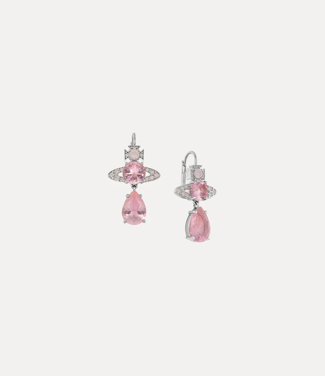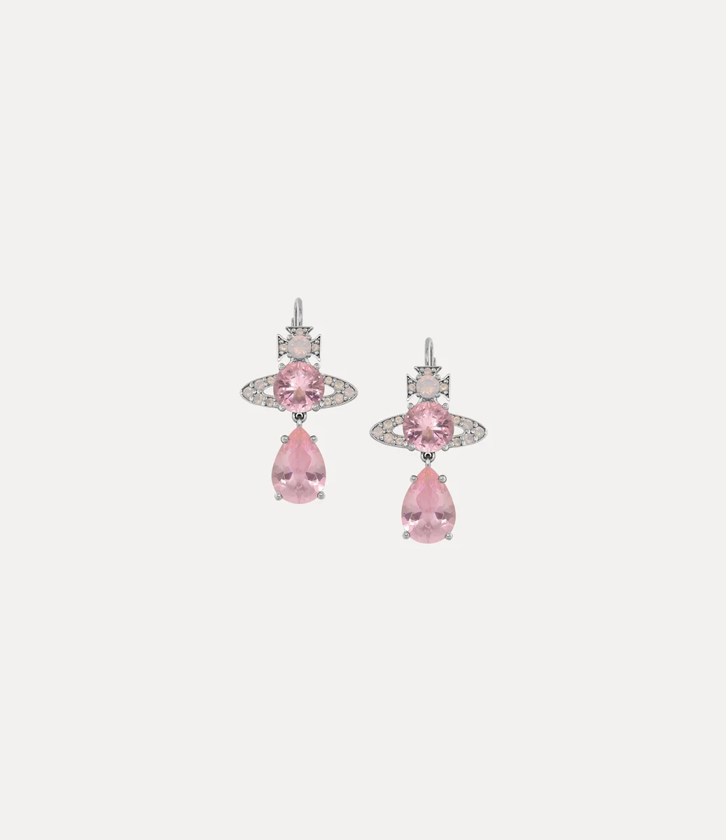 Unsere Ismene Drop Ohrringe sind aus silberfarbenem Metall gefertigt und verfügen über einen facettierten rosa Edelstein in der Mitte jeder Kugel und einen darunter hängenden tropfenförmigen Stein. Der Saturn-Ring ist mit zarten rosa Kristallen verziert, während das Kreuz an der Oberseite mit einem milchigen, schillernden Edelstein verziert ist.