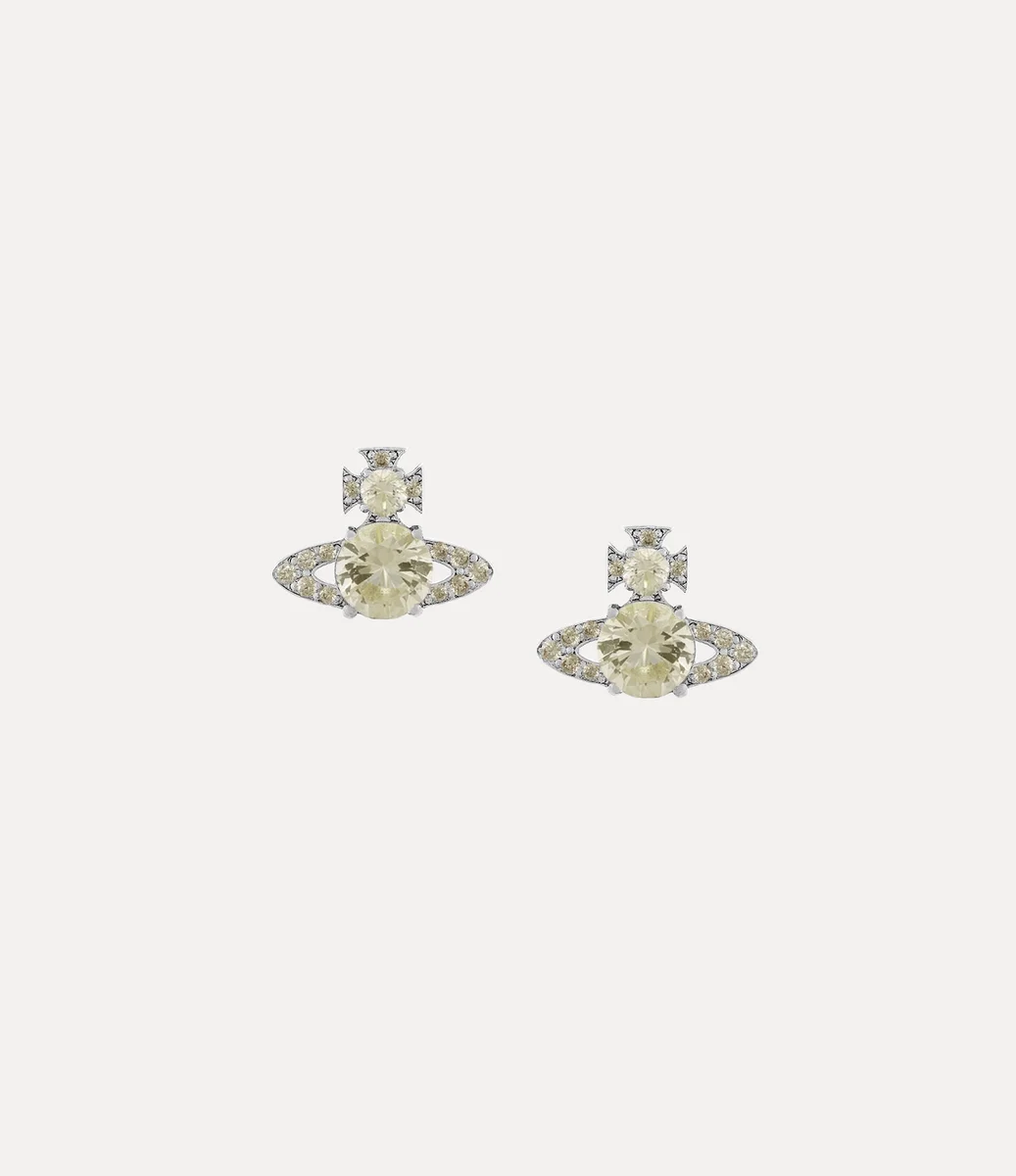 Unsere Ismene-Ohrringe kehren in dieser Saison zurück und zeichnen sich durch ein poliertes silberfarbenes Finish und gelbe Kristallakzente aus. Die Kugelform ist vom charakteristischen Kugelmotiv des Hauses inspiriert – ein Synonym für Viviennes Vision, Tradition in die Zukunft zu tragen.