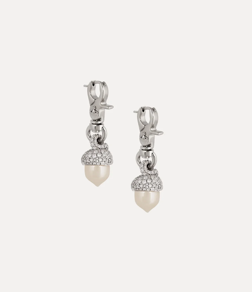 Die Lucille Large Ohrringe verfügen über einen drehbaren Verschluss im Hardware-Stil mit einem sicheren Scharnierstift, der das traditionelle Eichelmotiv mit einer schimmernden, perlenbeschichteten Basis und einer mit Kristallen verzierten Kappe aufweist. Das aufwendige Orb-Logo, das in den Verschluss eingraviert ist, rundet das Design ab und spiegelt Viviennes Vision wider, Tradition in die Zukunft zu tragen.