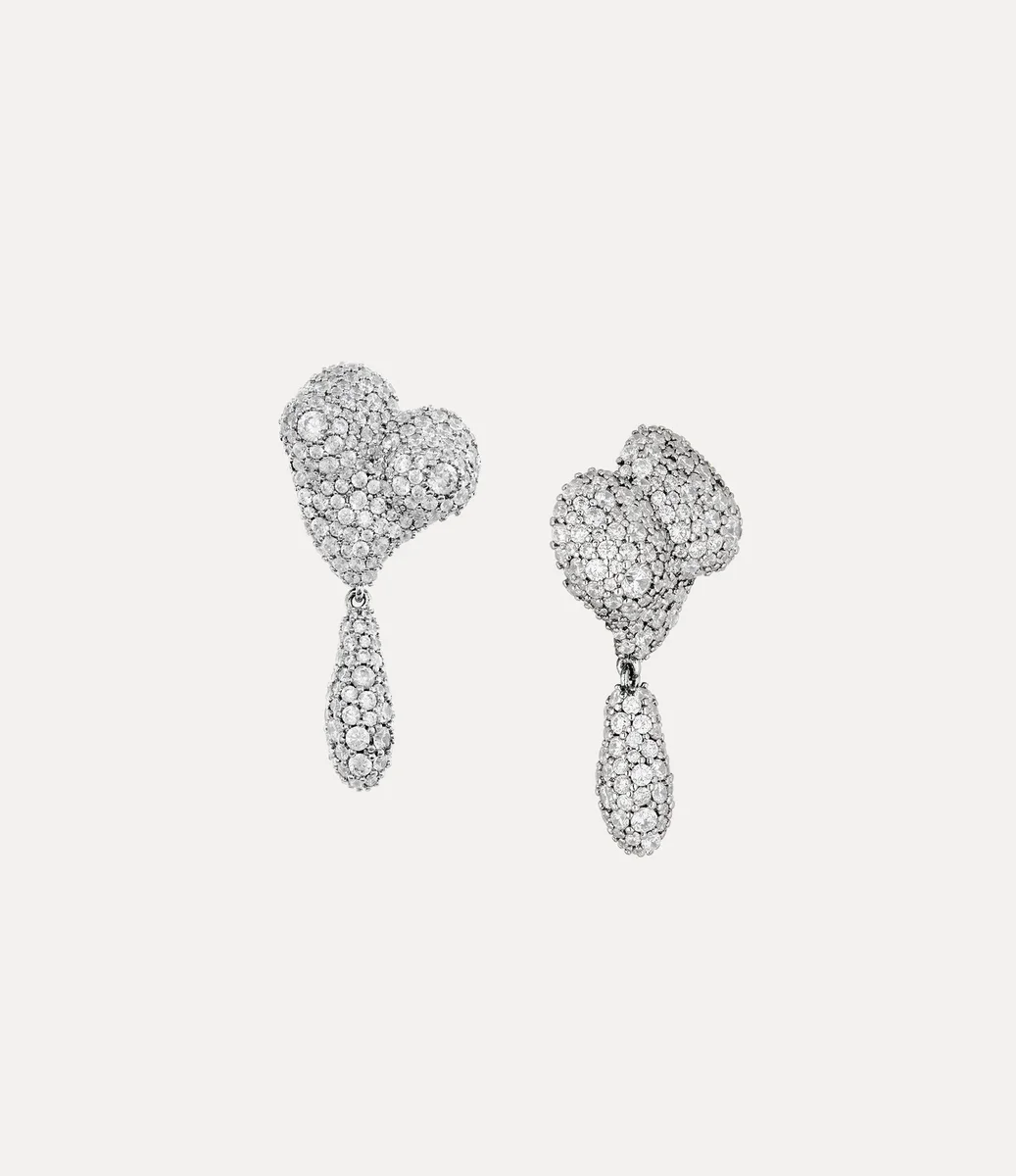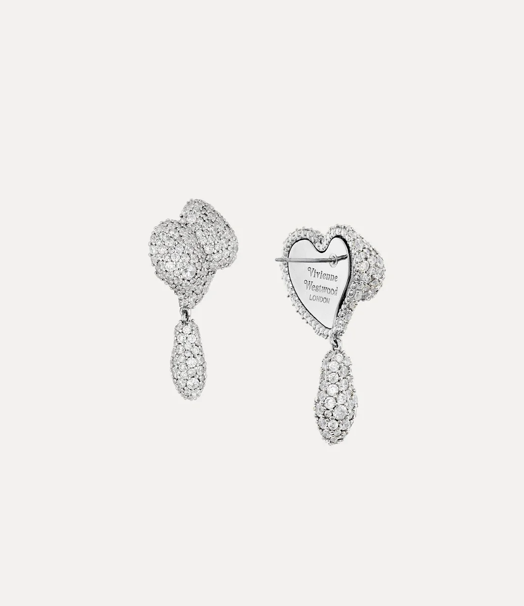 Unsere Mimosa Pave Ohrringe greifen das klassische asymmetrische Herzmotiv des Hauses wieder auf und erinnern an Viviennes Liebe zur Menschheit und zum Planeten. Das mit farblich abgestimmten Kristalldetails besetzte Schmuckstück ist filigran zu einer spitzen Form geformt und mit einem hängenden Tropfen versehen.