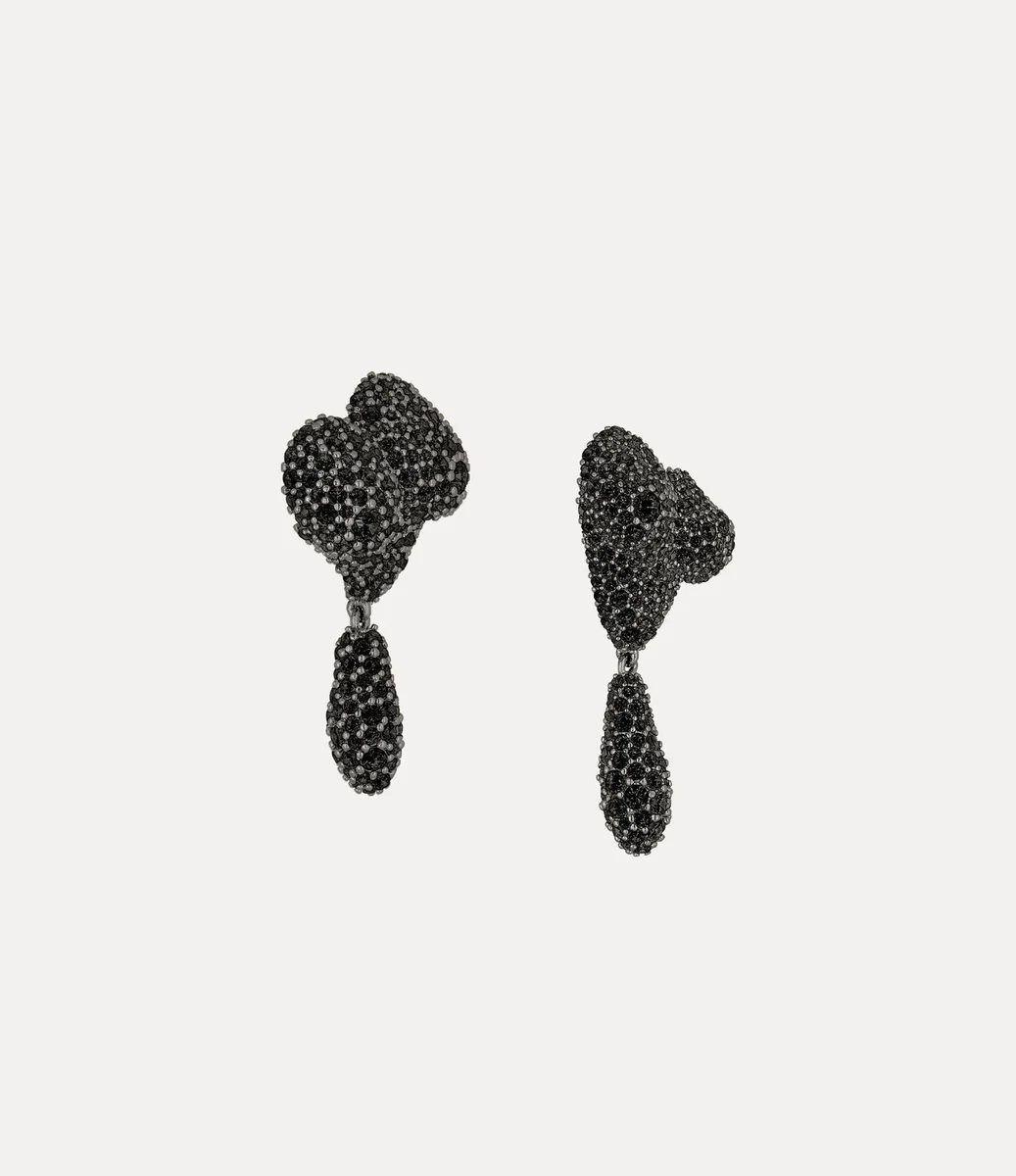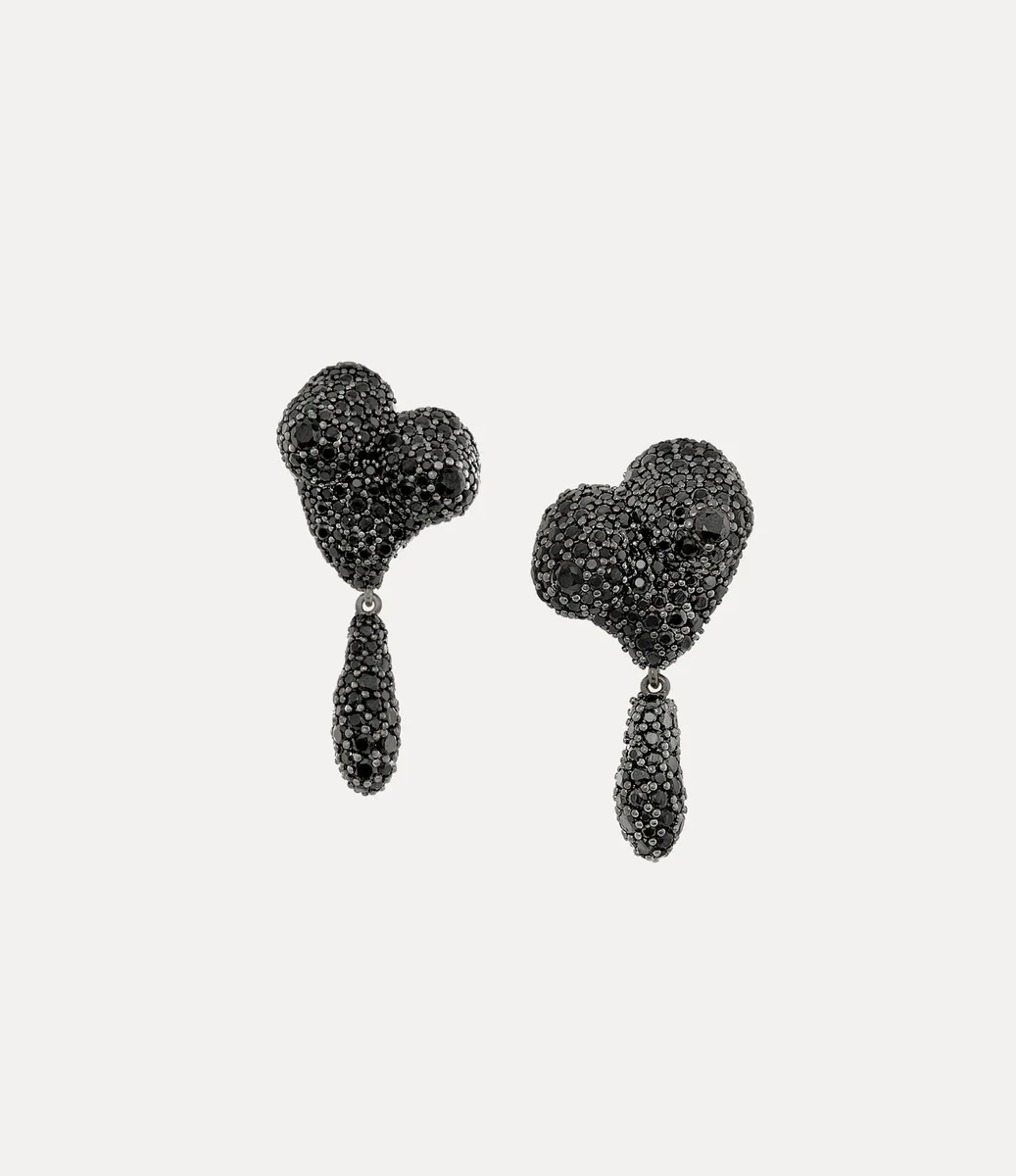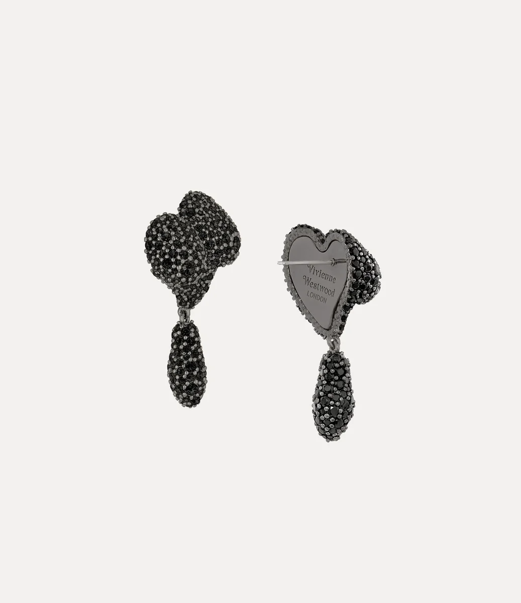 Unsere Mimosa Pave Ohrringe lassen das klassische asymmetrische Herzmotiv des Hauses wieder aufleben und erinnern an Viviennes Liebe zur Menschheit und zum Planeten. Das mit schwarzen Kristalldetails besetzte Schmuckstück ist filigran zu einer spitz zulaufenden Spitze geformt und mit einem hängenden Tropfen versehen.