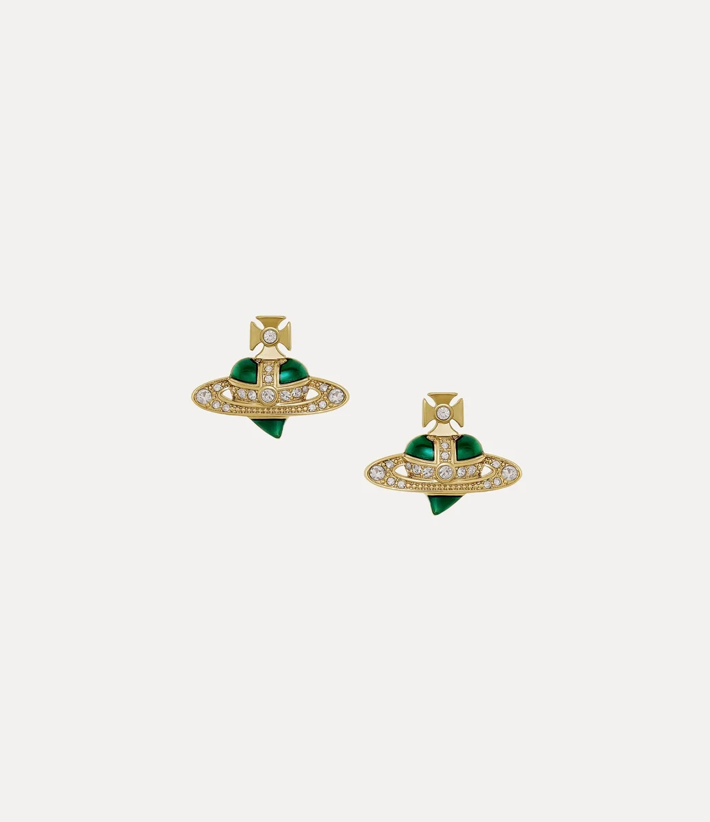 Die neuen Diamante Heart Ohrringe lassen das charakteristische asymmetrische Herzmotiv des Hauses wieder aufleben, mit dem Vivienne ihre Zuneigung zur Menschheit und zum Planeten zum Ausdruck brachte. Das mit glitzernden Pavé-Kristallen besetzte Design ist mit grünem, handgemaltem Emaille veredelt und mit unseren charakteristischen Kugelverschlüssen mit Schmetterlingsverschluss versehen.