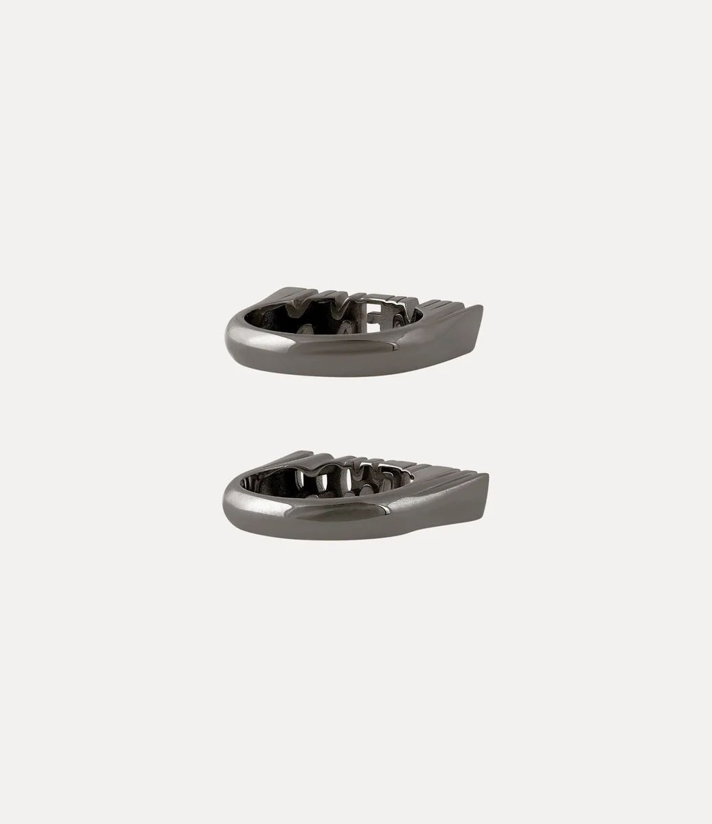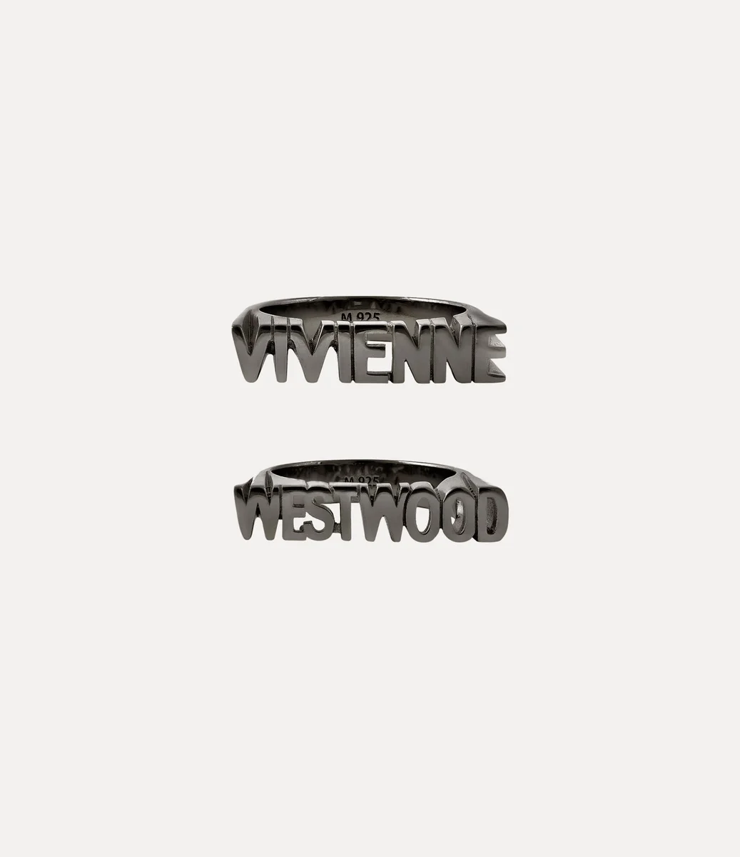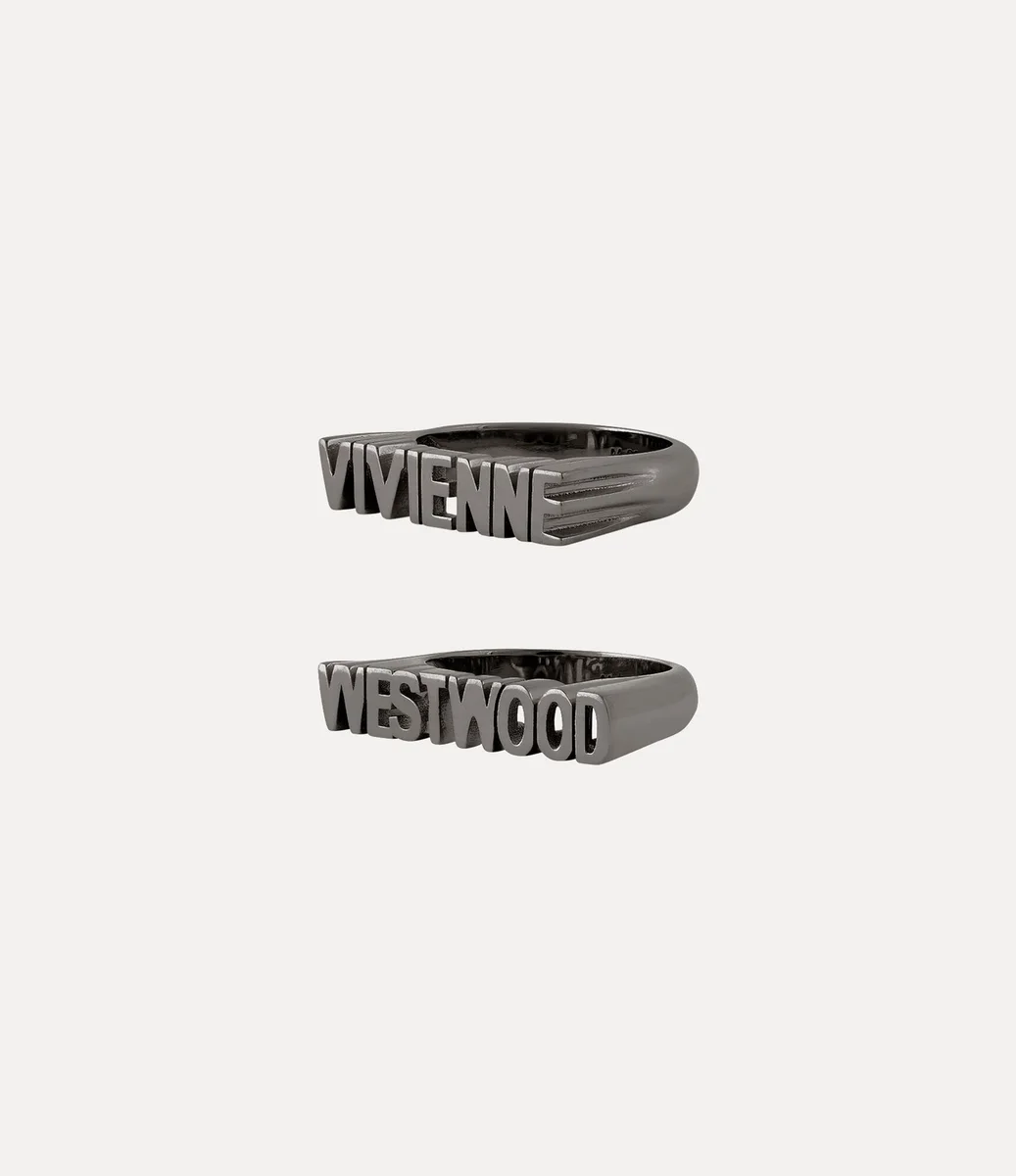 Unser Essex-Ring ist aus recyceltem Silber gefertigt und mit einer polierten, gunmetal-farbenen Beschichtung versehen. Das Design besteht aus zwei markanten Metallbändern, von denen eines „Vivienne” und das andere „Westwood” bildet, und wird durch aufwendige Ausschnitte akzentuiert, die die Konturen der einzelnen Buchstaben nachzeichnen.
