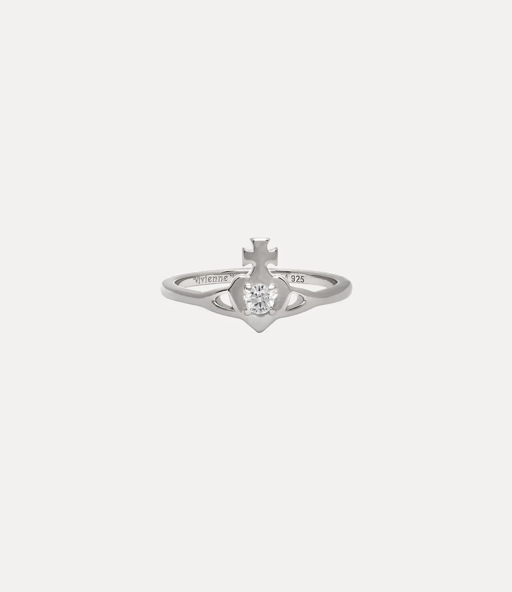 Die Herzform ist nach wie vor ein klassisches Element der Hausikonografie und erinnert an Viviennes Zuneigung zur Menschheit und zum Planeten. Unser Noella-Ring greift das Motiv wieder auf, komplett mit polierter, platinfarbener Beschichtung und weißen Kristallverzierungen.