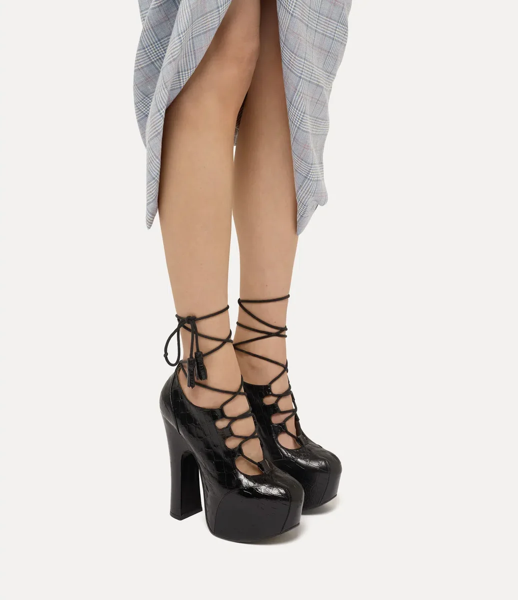 Inspiriert von der schottischen Highland-Tracht interpretieren unsere Elevated Ghille-Plateauschuhe den klassischen Ghillie-Brogue neu und sind mit einem krokodilartigen Prägemuster über das gesamte Design versehen. Das Modell verfügt über eine kurze, abgerundete Vorderseite mit charakteristischen Cut-out-Akzenten und langen Quastenschnürsenkeln, die sich um den Knöchel wickeln.