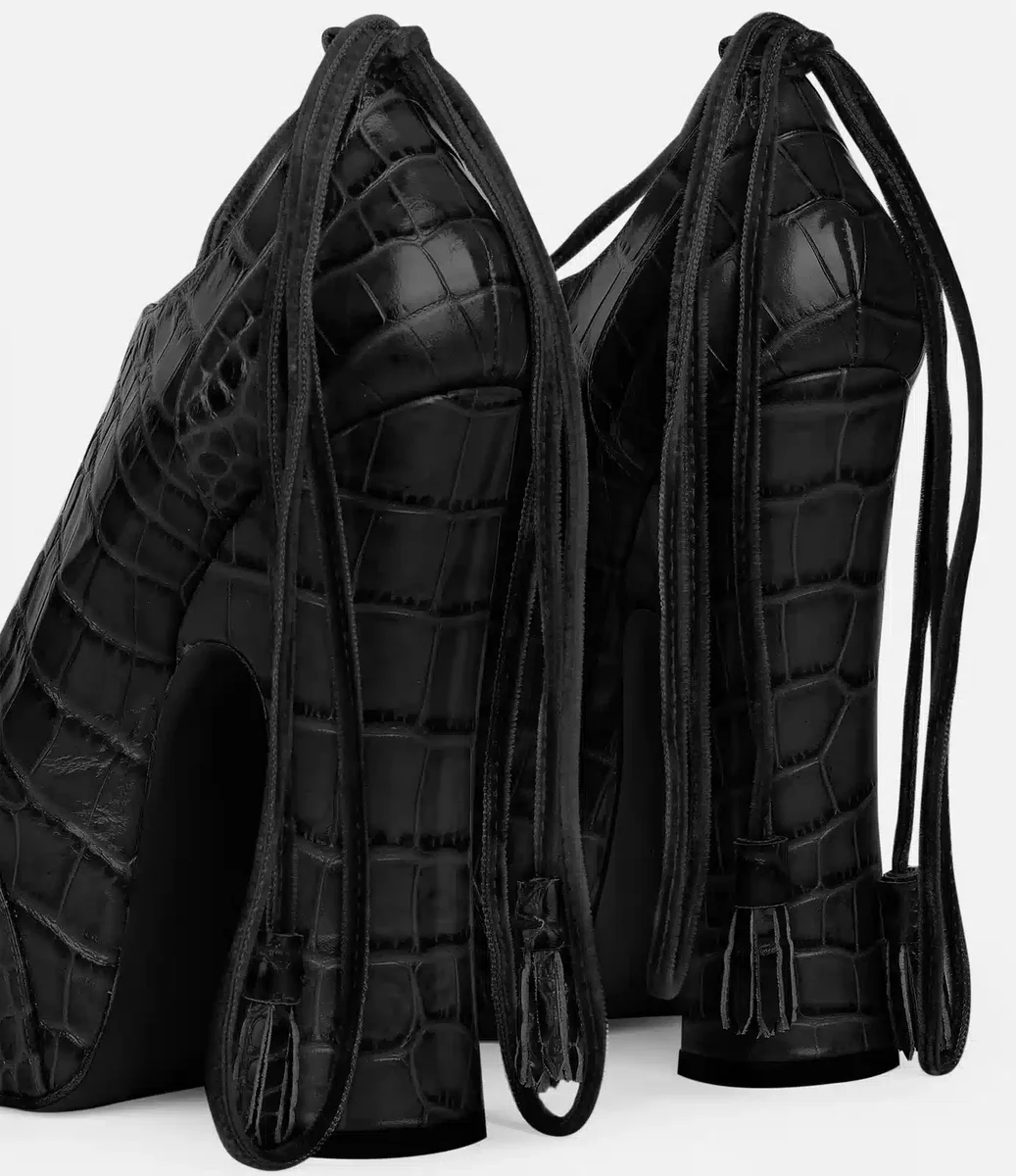 Inspiriert von der Tracht der schottischen Highlands interpretieren unsere Elevated Ghille-Plateauschuhe den klassischen Ghillie-Brogue neu und sind mit einem Krokodilprägungsmotiv über das gesamte Design versehen. Das Modell verfügt über eine kurze, abgerundete Vorderseite mit charakteristischen Cut-out-Akzenten und langen Tassel-Schnürsenkeln, die sich um den Knöchel wickeln.