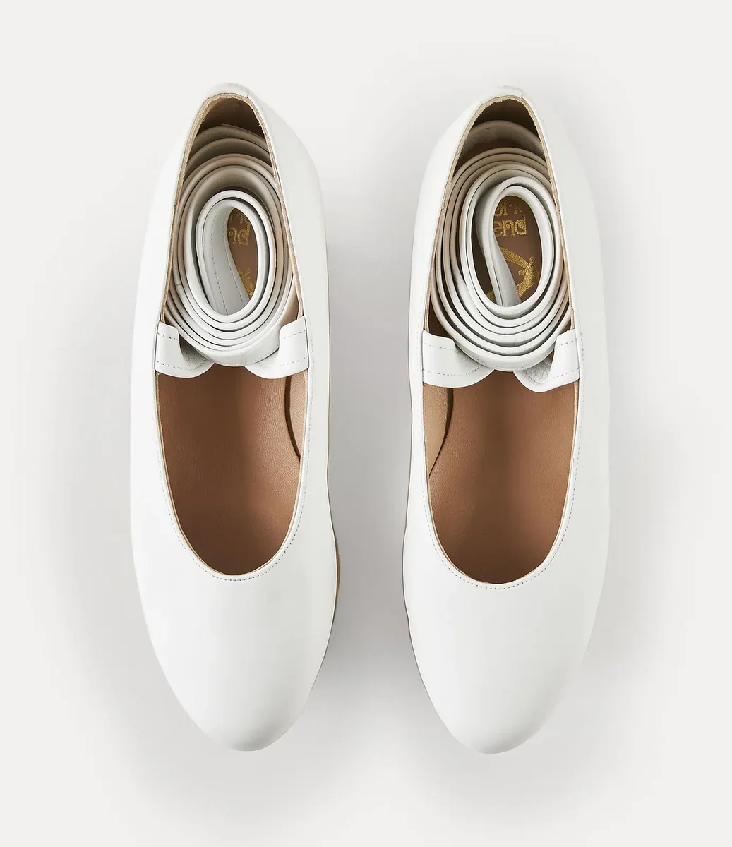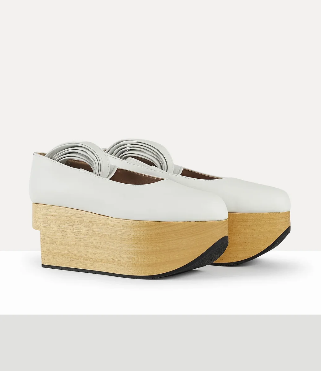 Unsere Rocking Horse Ballerina-Schuhe wurden erstmals in der Vivienne Westwood Herbst/Winter-Kollektion „Harris Tweed” 1987/88 vorgestellt und wurden entwickelt, um Eleganz und Bewegungsfreiheit zu erzielen. Die geschwungene Vorderseite und die Cut-out-Details im hohen Holzplateau ermöglichen es der Trägerin, beim Gehen nach vorne zu schwingen, während die zarten Lederbänder von Ballett-Spitzenschuhen inspiriert sind.