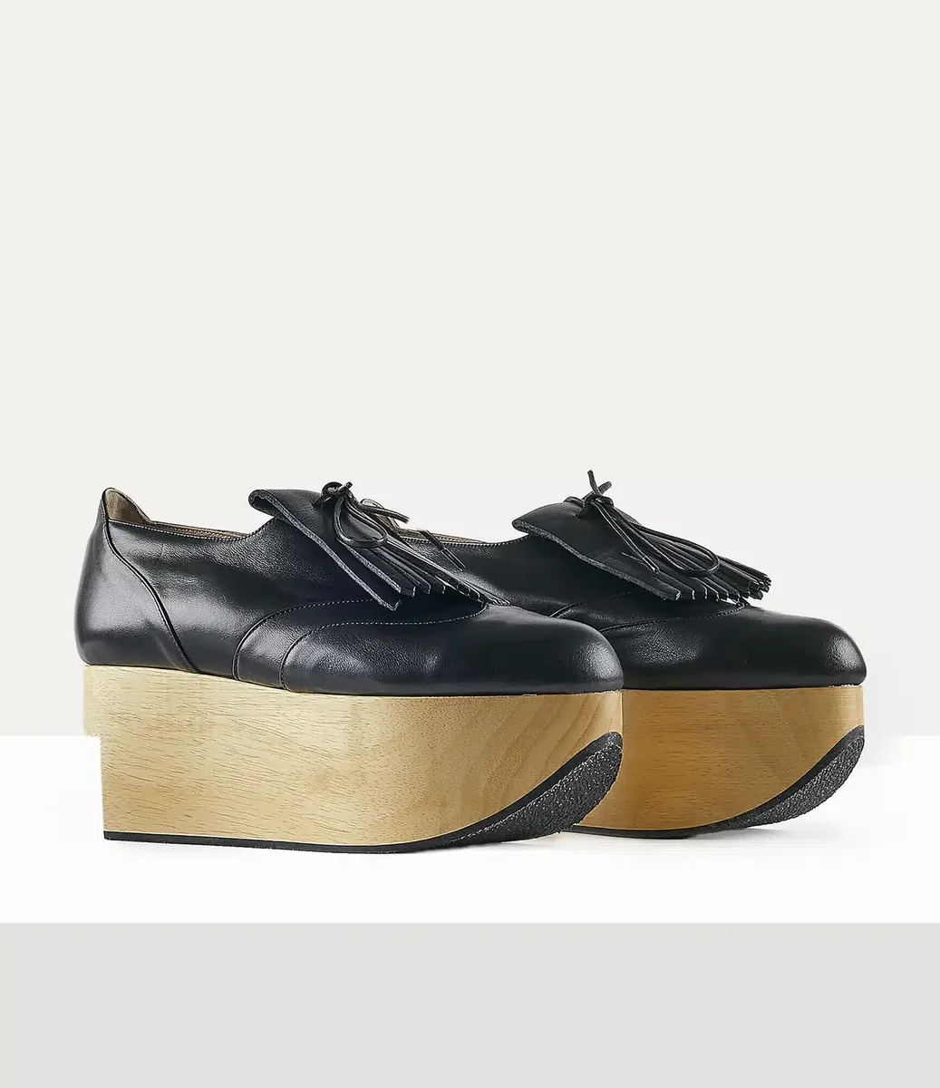 Die Rocking Horse Golfschuhe sind von klassischen britischen Golfschuhen inspiriert und zeichnen sich durch aufwendige Ziernähte und ein markantes Lederfransendetail aus, das die Schnürsenkel elegant verdeckt. Das Design wird durch kontrastierende Holzplattformen unterstrichen, die sich durch eine geschwungene Vorderseite und charakteristische Ausschnitte auszeichnen – Elemente, die erstmals in der Herbst/Winter-Kollektion 1987/88 „Harris Tweed” eingeführt wurden.