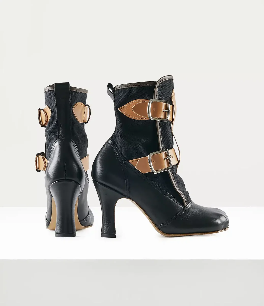 Unsere Bondage-Stiefel, die erstmals in der Frühjahr/Sommer-Kollektion 2002 „Nymphs” zu sehen waren, verfügen über ein Seditionary-Obermaterial, das von den historischen Seditionaries-Stiefeln inspiriert ist. Die Stiefel zeichnen sich durch die charakteristische tierförmige Zehenkappe aus, die in der Frühjahr/Sommer-Kollektion 2000 „Summertime” eingeführt wurde, die Pfote eines Tieres imitiert und einen einzigartigen Abdruck hinterlässt. Das Design mit Lederriemen mit Rollschnallen erinnert an die Themen Einschränkung und Kontrolle aus Bondage- und Fetischkleidung.