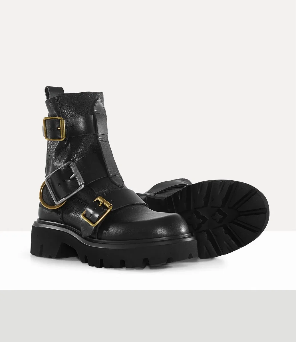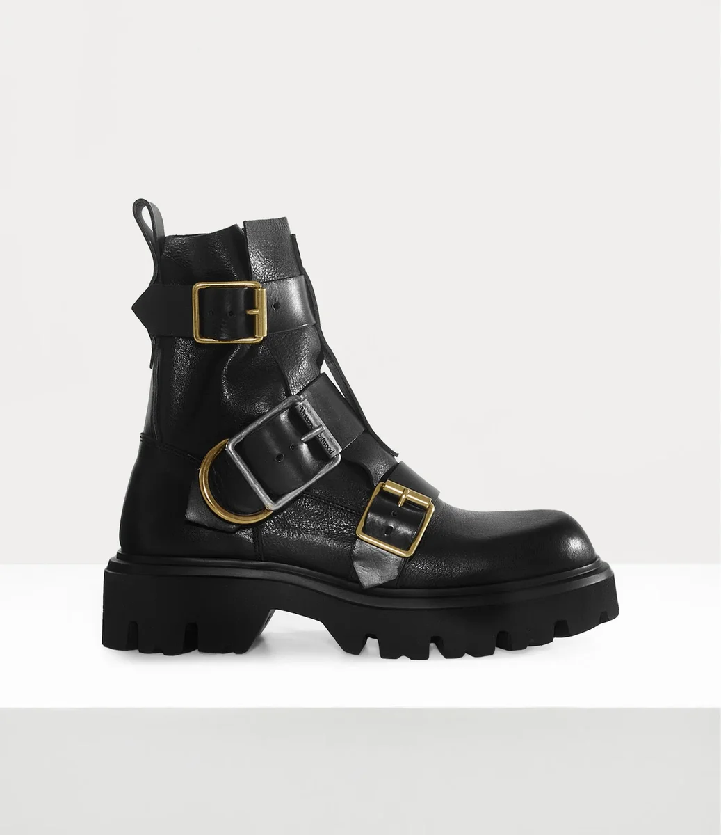 Die Empire-Stiefel sind von den historischen Rome-Stiefeln inspiriert, die erstmals in der Herbst/Winter-Kollektion 1983 des Hauses vorgestellt wurden. Das Design zeichnet sich durch ein geöltes Lederfinish aus, das mit Lederriemen und Rollschnallen verziert ist und an Themen wie Einschränkung und Kontrolle erinnert, die von Bondage- und Fetischkleidung inspiriert sind.