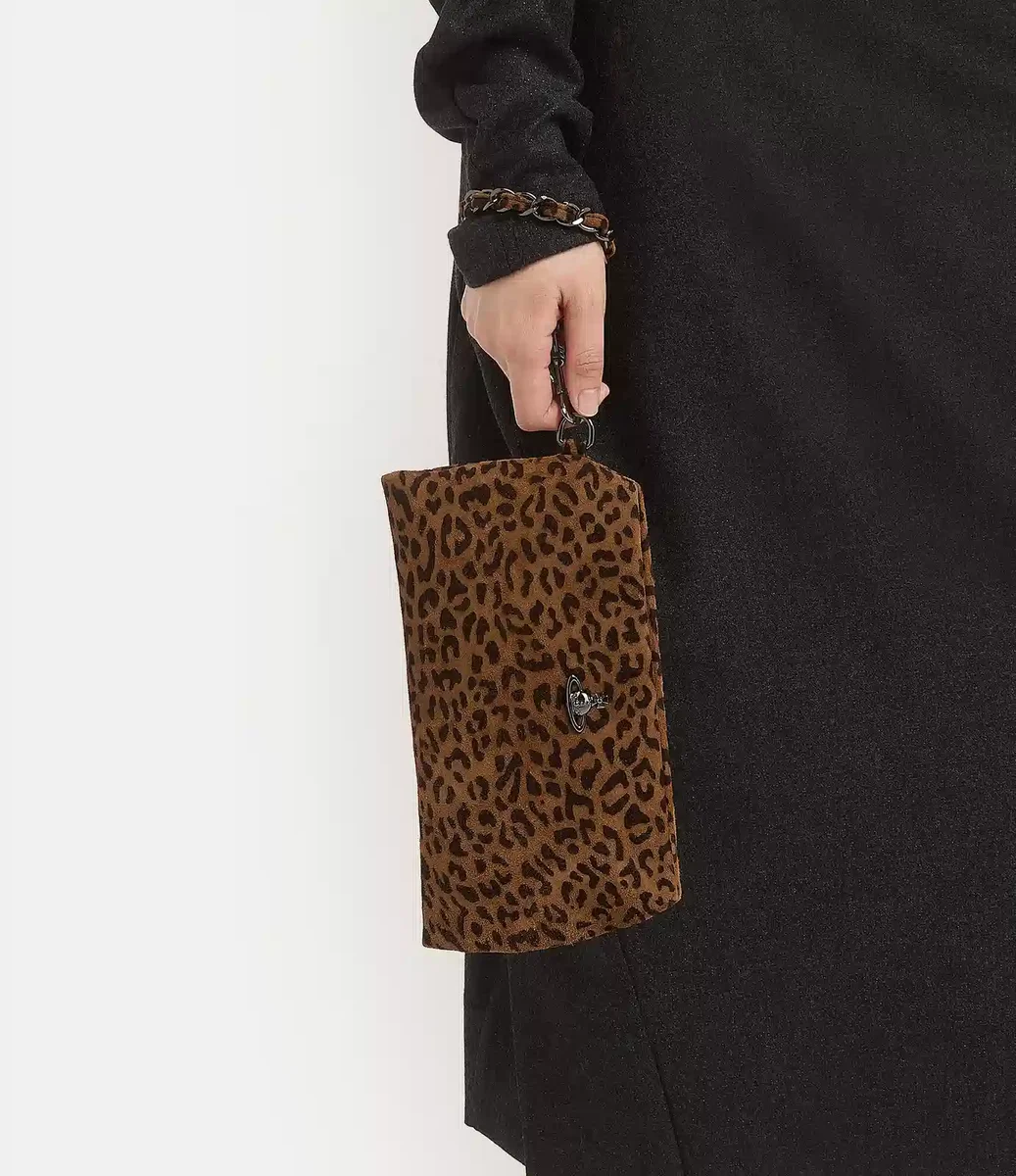 Die Sadie-Handgelenktasche wurde neu interpretiert und präsentiert sich nun in weichem Wildleder mit Leopardenmuster und einer leicht gepolsterten, rechteckigen Silhouette. Das Design zeichnet sich durch eine silberfarbene Kette aus, die mit passendem Wildleder verwoben ist und vorne mit einem polierten Reliefkugel verziert ist.
