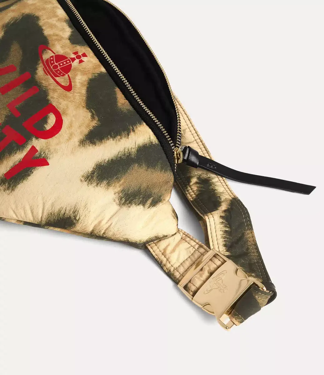 Die Vivienne Westwood Ada Body Bag hat ein halbmondförmiges Nylonprofil und ist mit einem auffälligen Leopardenmotiv bedruckt.