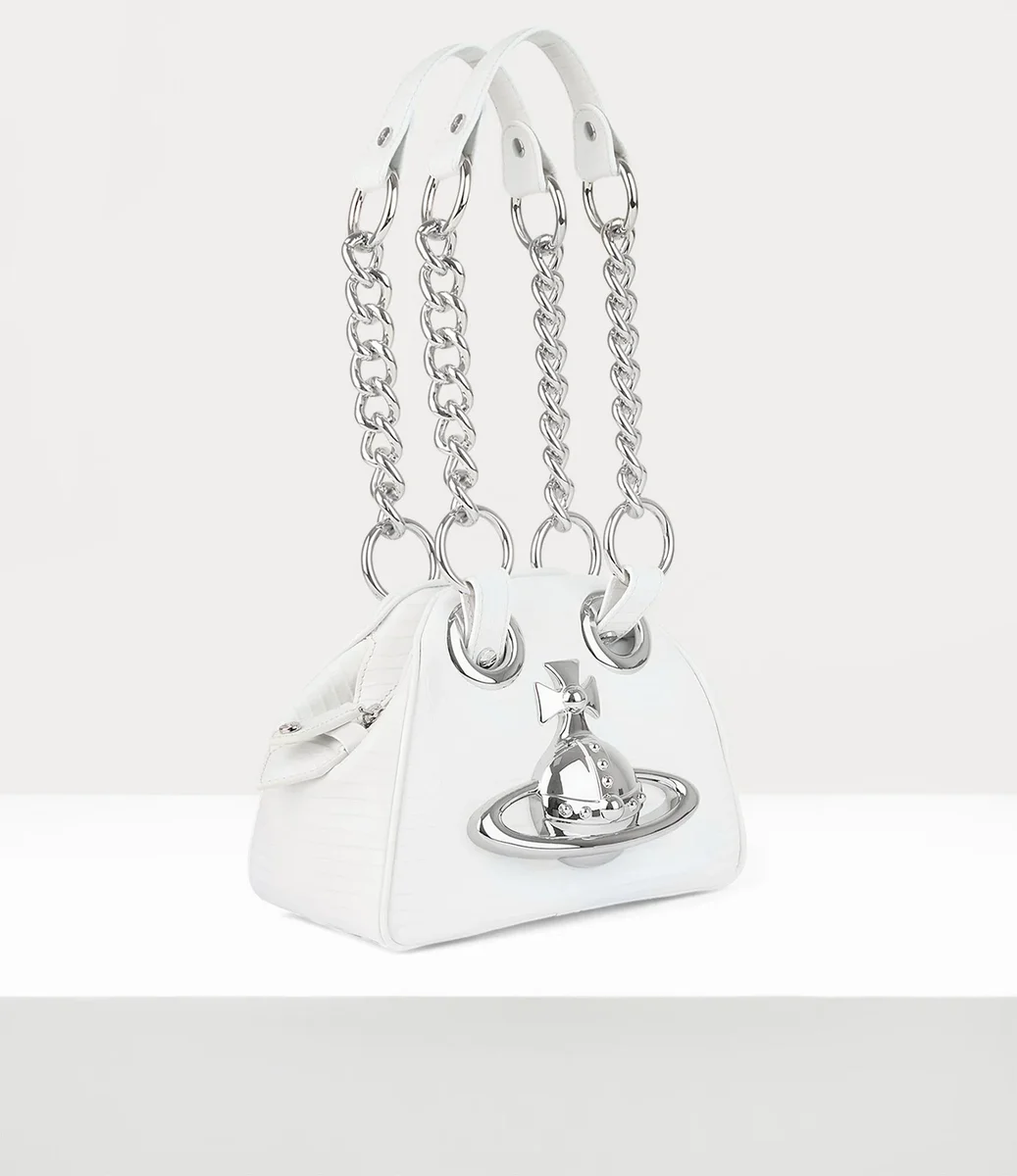 Unsere Handtasche „Archive Orb Chain“, die erstmals in der Frühjahr/Sommer-Kollektion 1991 „Cut, Slash & Pull“ von Vivienne Westwood zu sehen war, wurde in dieser Saison aus „Mini“-Krokodilleder mit Prägung neu interpretiert. Das Modell verfügt über ein großes dreidimensionales Kugelmotiv auf der Vorderseite, ergänzt durch Bondage-inspirierte Ringe und Kettenverzierungen entlang der Riemen.