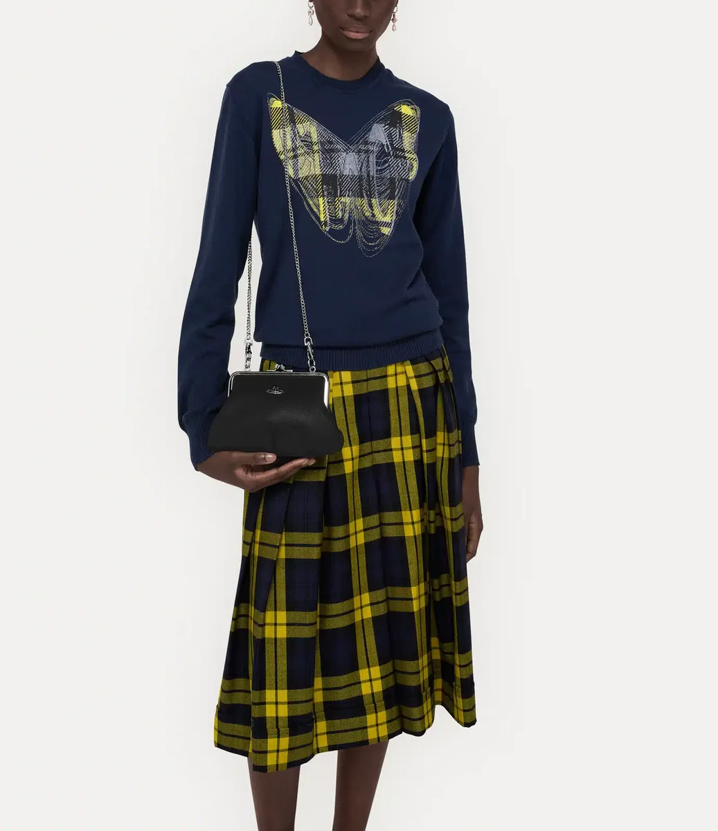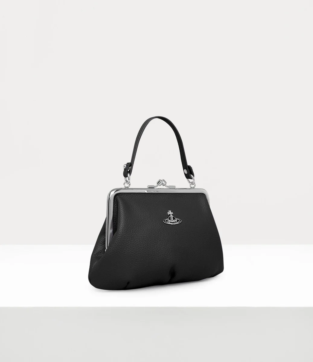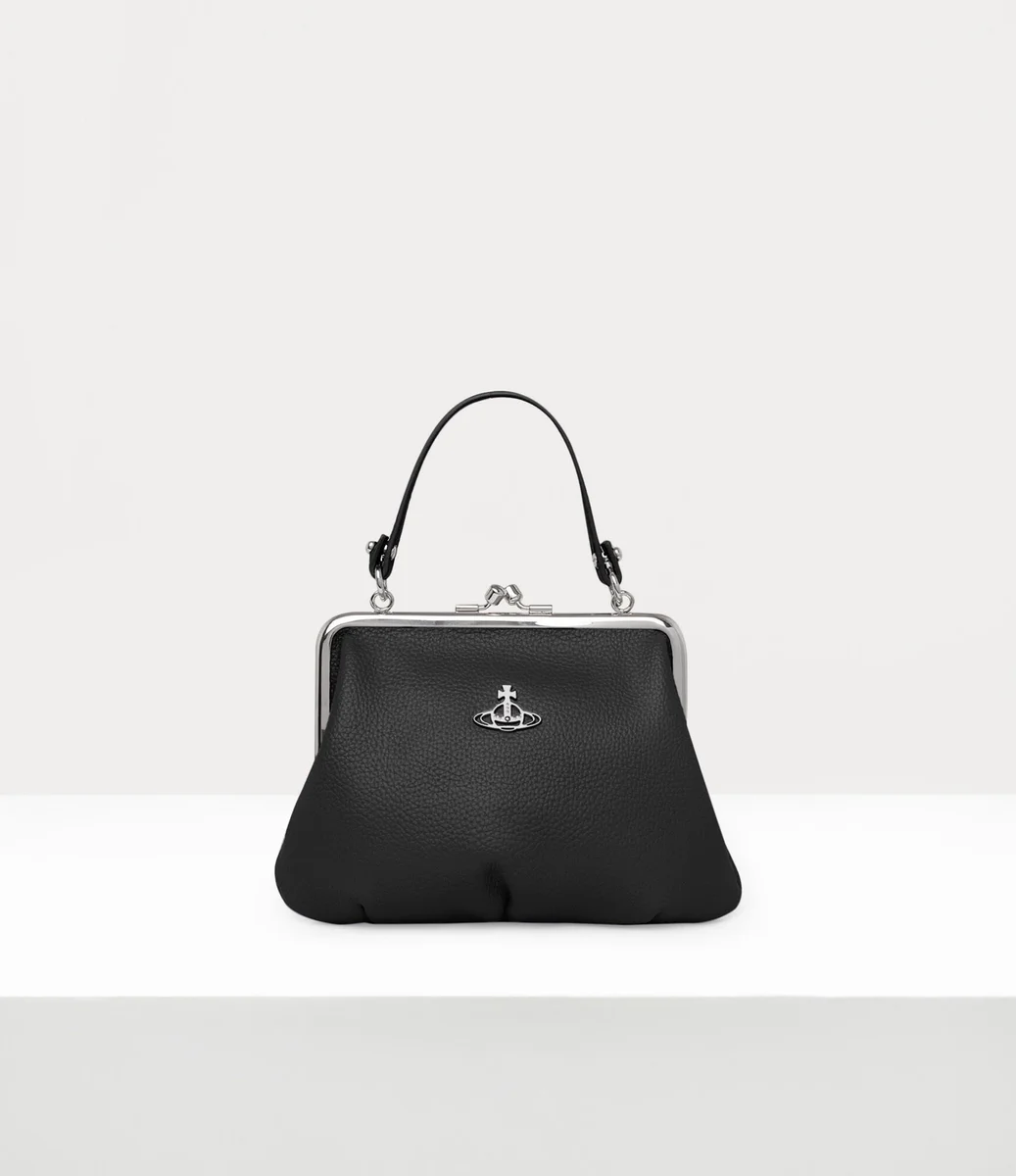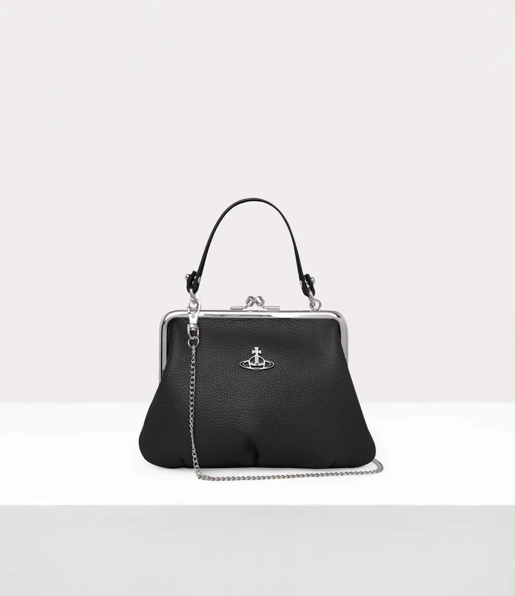 Unsere Granny Frame Handtasche hat eine Vintage-inspirierte Silhouette und einen Kiss-Lock-Verschluss, der an antike Geldbörsen aus dem frühen 20. Jahrhundert erinnert. Das Modell ist mit weichem PU-Leder überzogen und mit unserem klassischen „Line Orb”-Motiv verziert, das Tradition symbolisiert, umgeben von den himmlischen Ringen des Saturn, die für die Zukunft stehen.