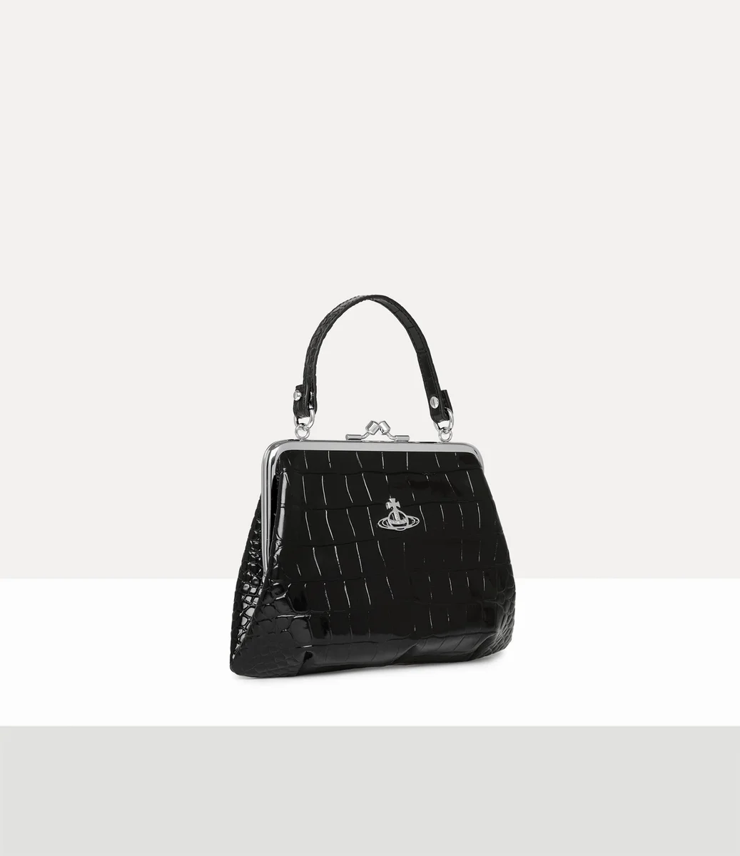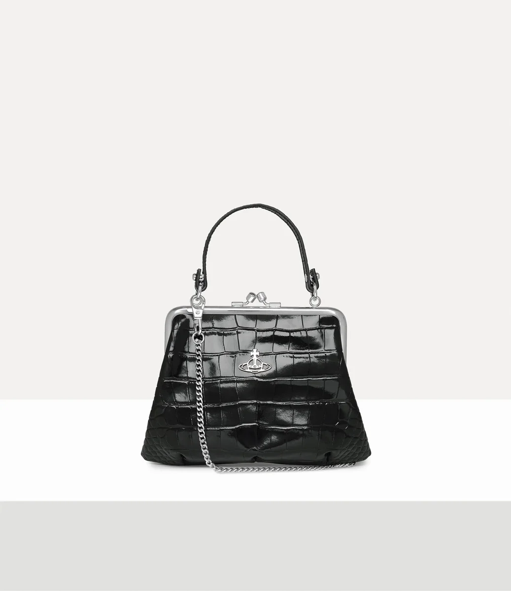 Die Silhouette der Granny Frame Handtasche erinnert an antike Geldbörsen aus dem frühen 20. Jahrhundert und verfügt über einen Metallrahmen mit einem sicheren Kiss-Lock-Verschluss. Das Modell ist mit einer Krokodilprägung versehen und auf der Vorderseite mit unserem klassischen Orb-Motiv verziert, das für die Philosophie des Hauses steht, die Vergangenheit in die Zukunft zu übertragen.