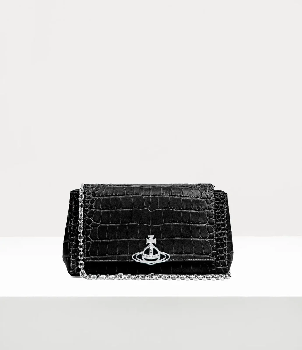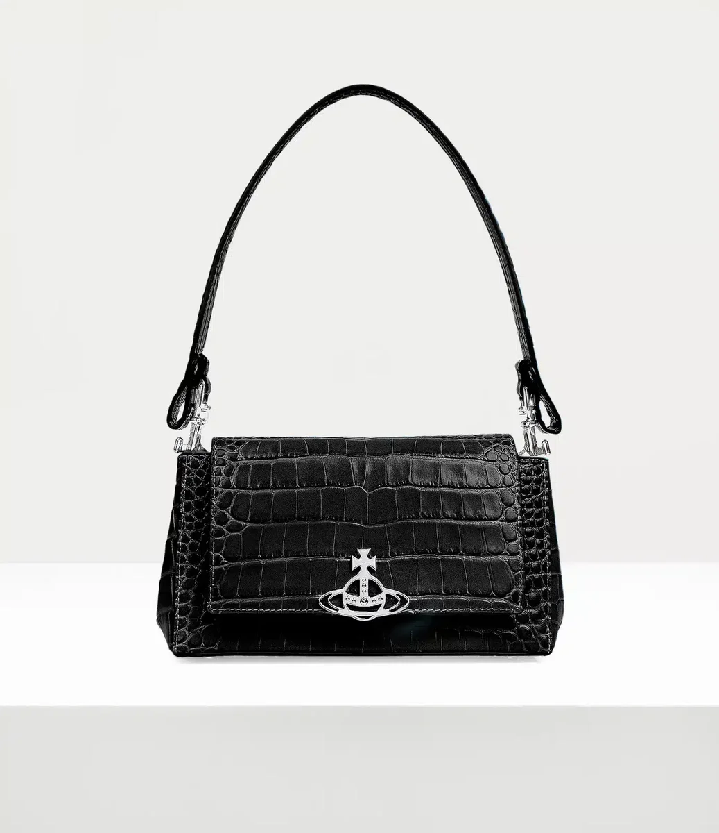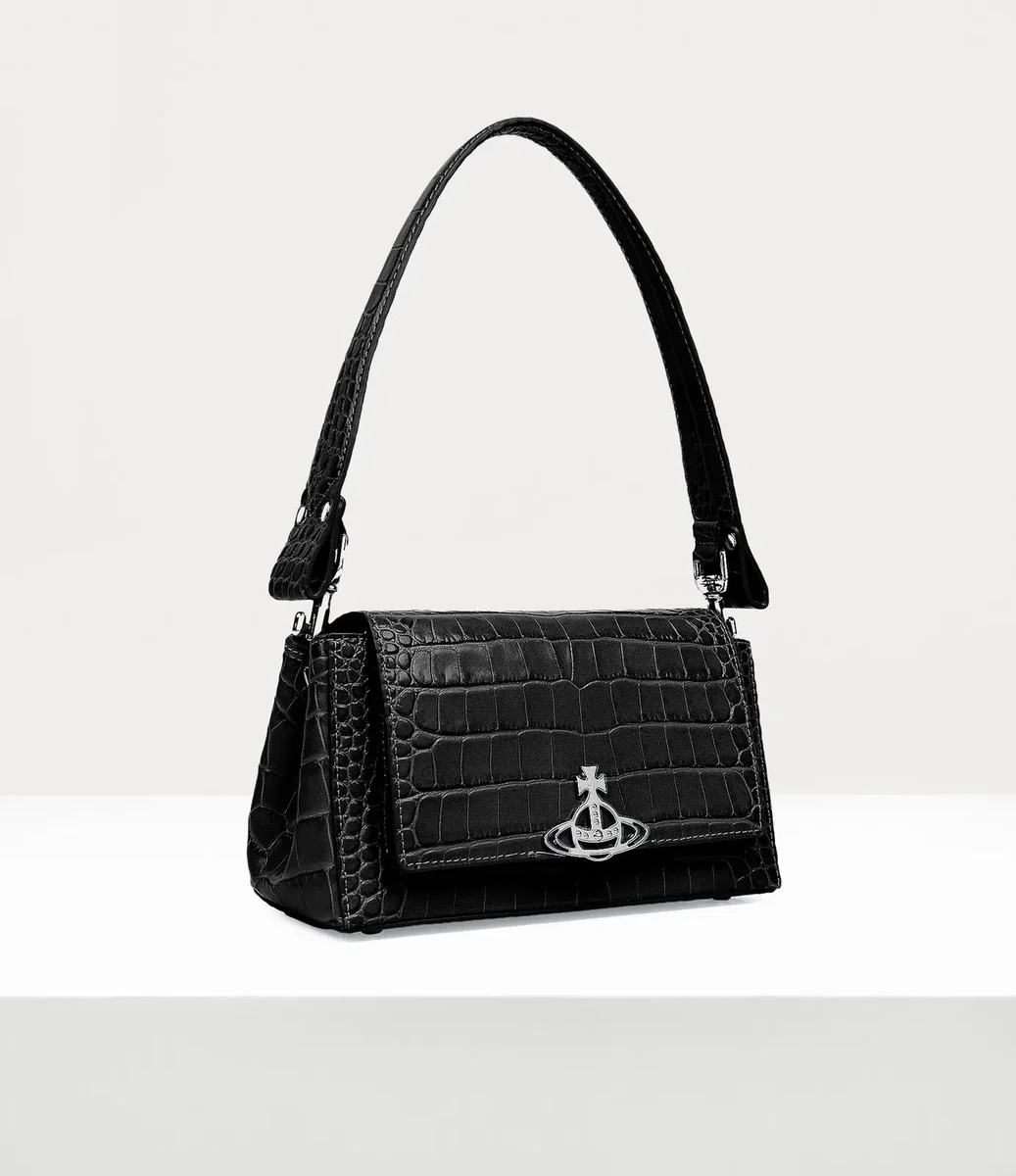 Die mittelgroße Handtasche Hazel mit Krokodilprägung hat eine von „Soft Punk” inspirierte Baguette-Silhouette und verfügt über ein Futter mit gebrochenen Nadelstreifen und einen Kosmetikspiegel. Der Verschluss mit Frontklappe ziert das Orb-Motiv unseres Hauses, das Vivienne Westwoods Vision von der Verschmelzung von Vergangenheit und Zukunft verkörpert.