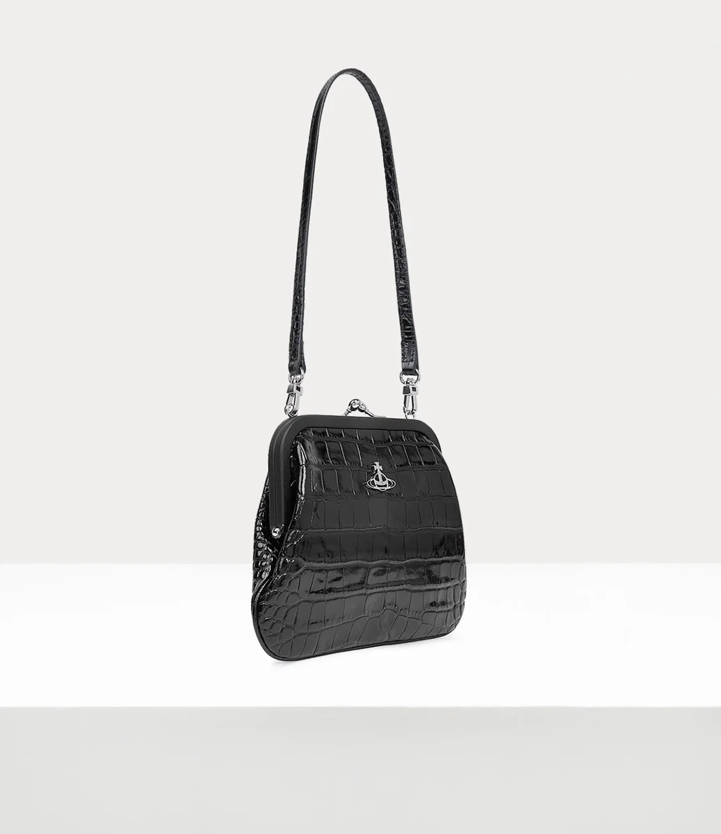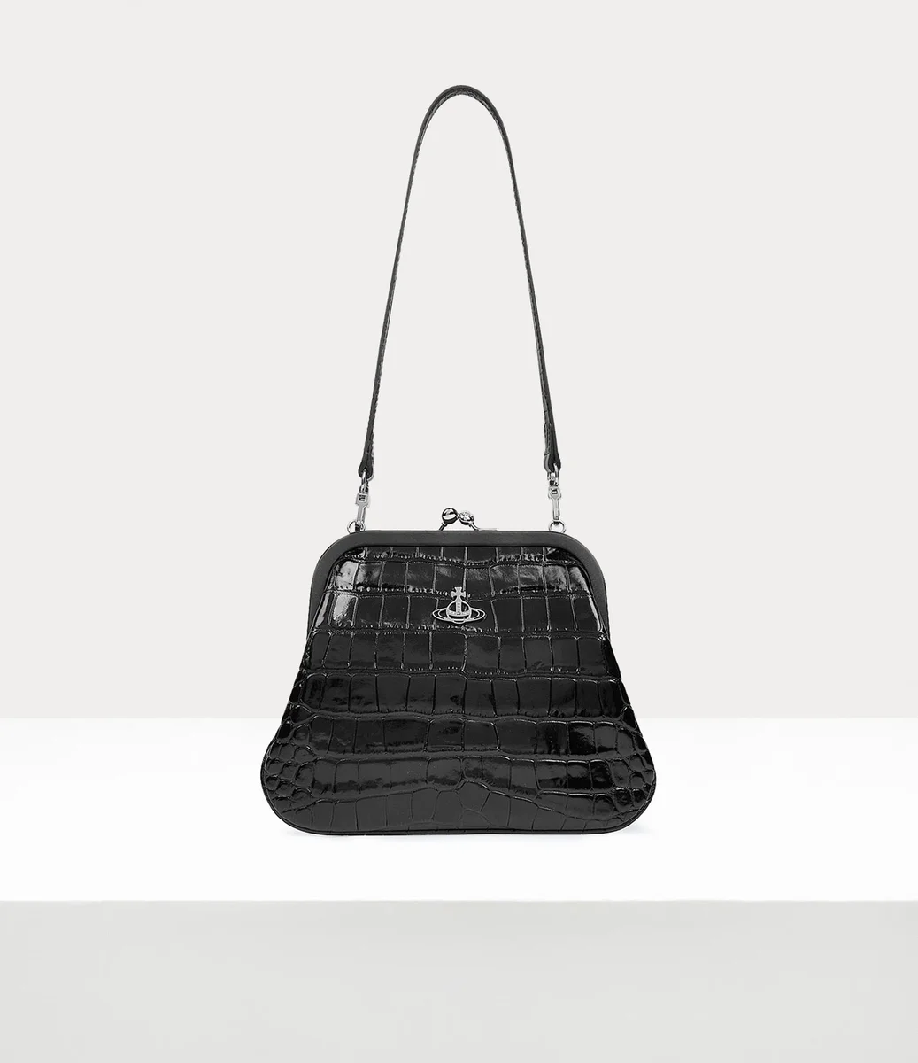 Unsere Vivienne-Clutch ist in glänzendem Leder mit einem Vintage-inspirierten Kiss-Lock-Verschluss und einer Krokodilprägung erhältlich. Das Modell ist nach Vivienne benannt, die diesen Stil besonders mochte, und mit unserem charakteristischen „Line Orb”-Motiv auf der Vorderseite verziert.