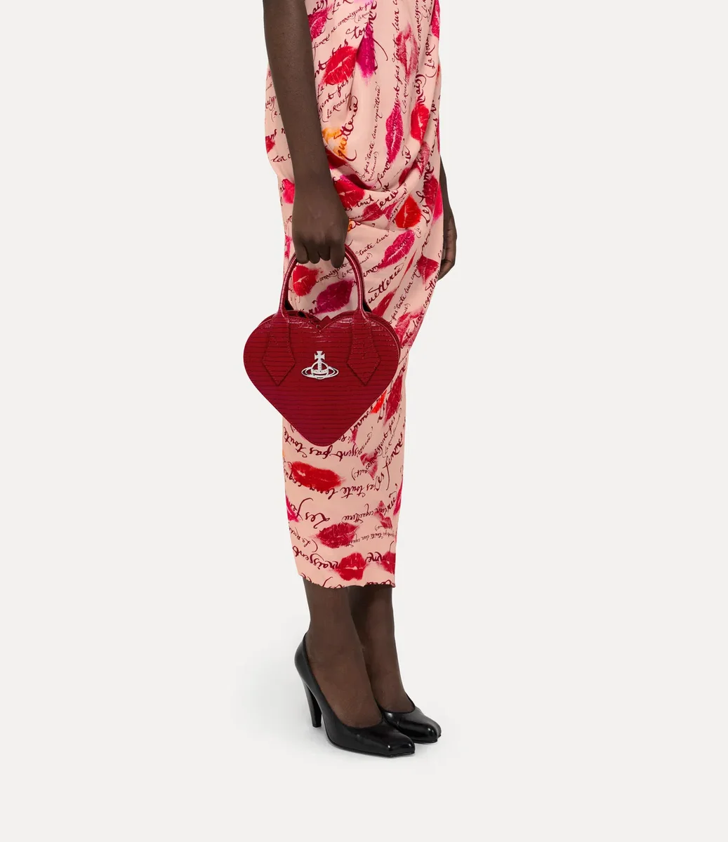 Die Vivienne Westwood Josephine Heart Crossbody aus geprägtem Leder in Krokodillook hat ein herzförmiges Design mit einem oberen Griff und einer Kugel auf der Vorderseite.