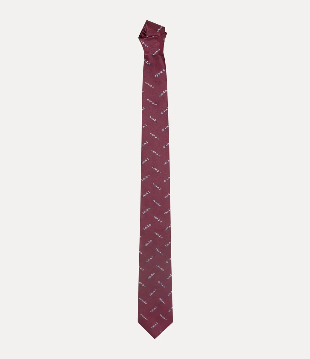 Unsere Seidenkrawatte hat ein breites Blatt, das sich zu einer klassischen spitzen Spitze verjüngt. Das Design wird durch den charakteristischen „CHAOS”-Slogan des Hauses abgerundet, der sich über die gesamte Krawatte wiederholt und Viviennes rebellischen Geist und ihr Engagement für die Infragestellung politischer Konventionen widerspiegelt.