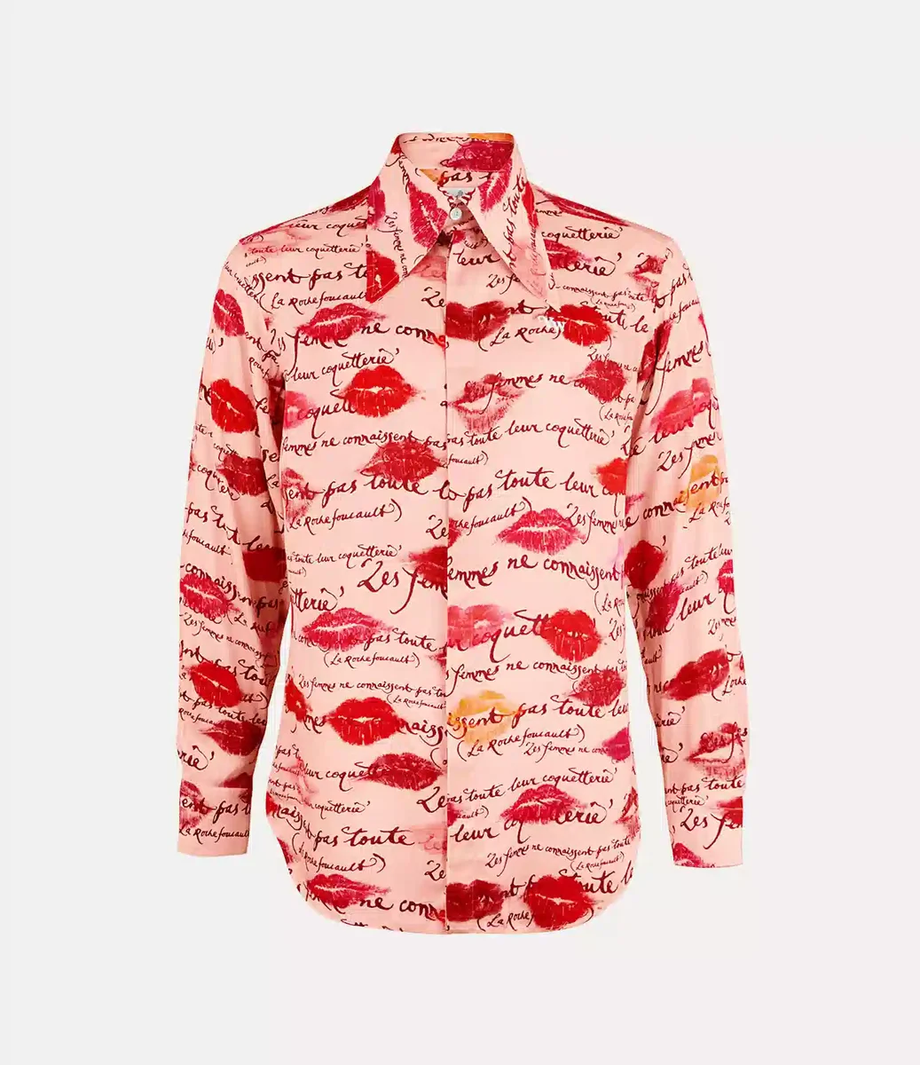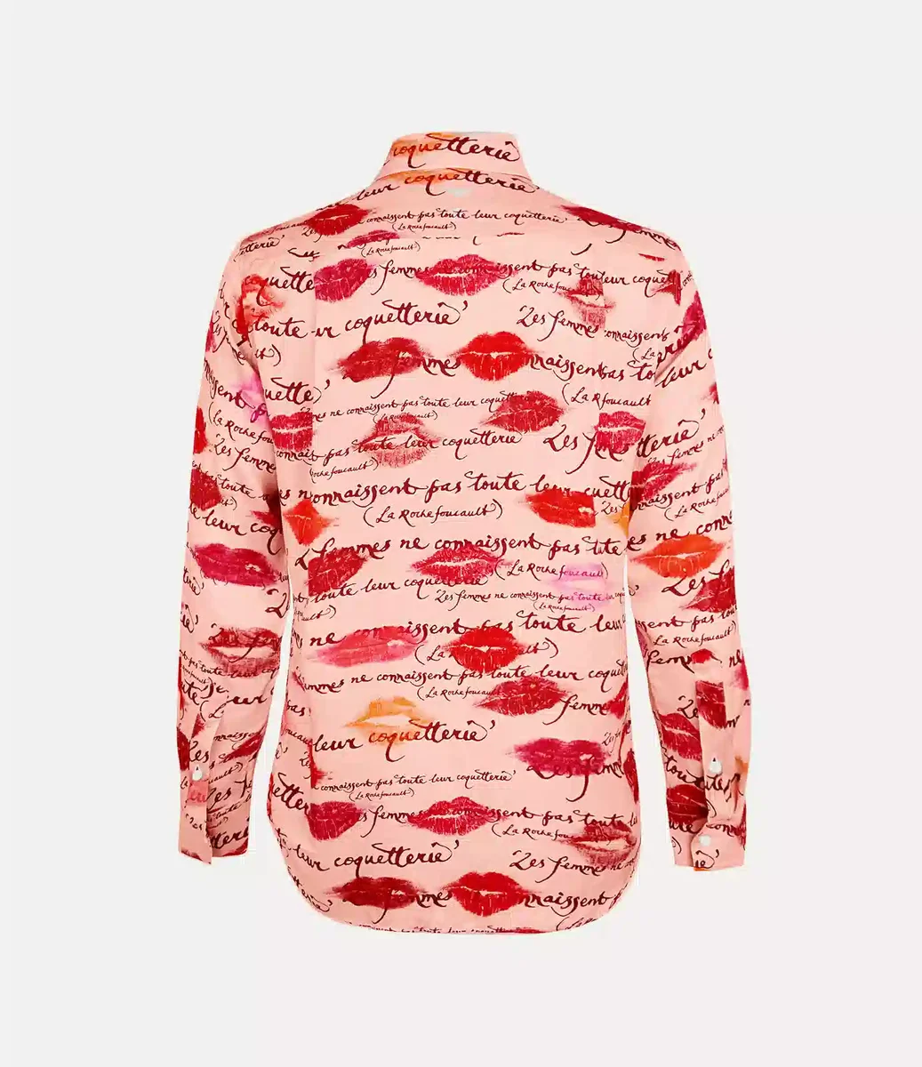 Unser Smokinghemd verfügt über einen übertrieben spitzen Kragen mit verdeckter Knopfleiste. Das Kleidungsstück ist mit dem „Kisses”-Motiv verziert, das von der Verpackung unseres Parfums „Boudoir” inspiriert ist und mit Viviennes handgeschriebenem Motiv „Les Femmes Ne Connaissent Pas Toute Leur Coquetterie” überlagert ist.