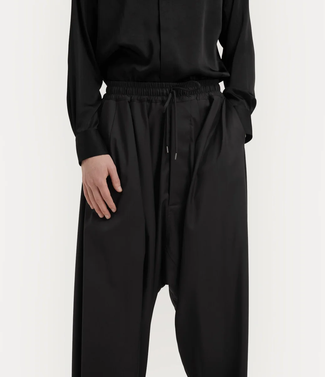 Unsere Balloon-Hose wurde in dieser Saison neu interpretiert und präsentiert sich nun in weicher Wolle, mit hoher Taille und fließendem Kordelzugverschluss. Der tief sitzende Schritt geht in eine voluminöse, weite Silhouette über, während zwei Pattentaschen die Rückseite zieren.