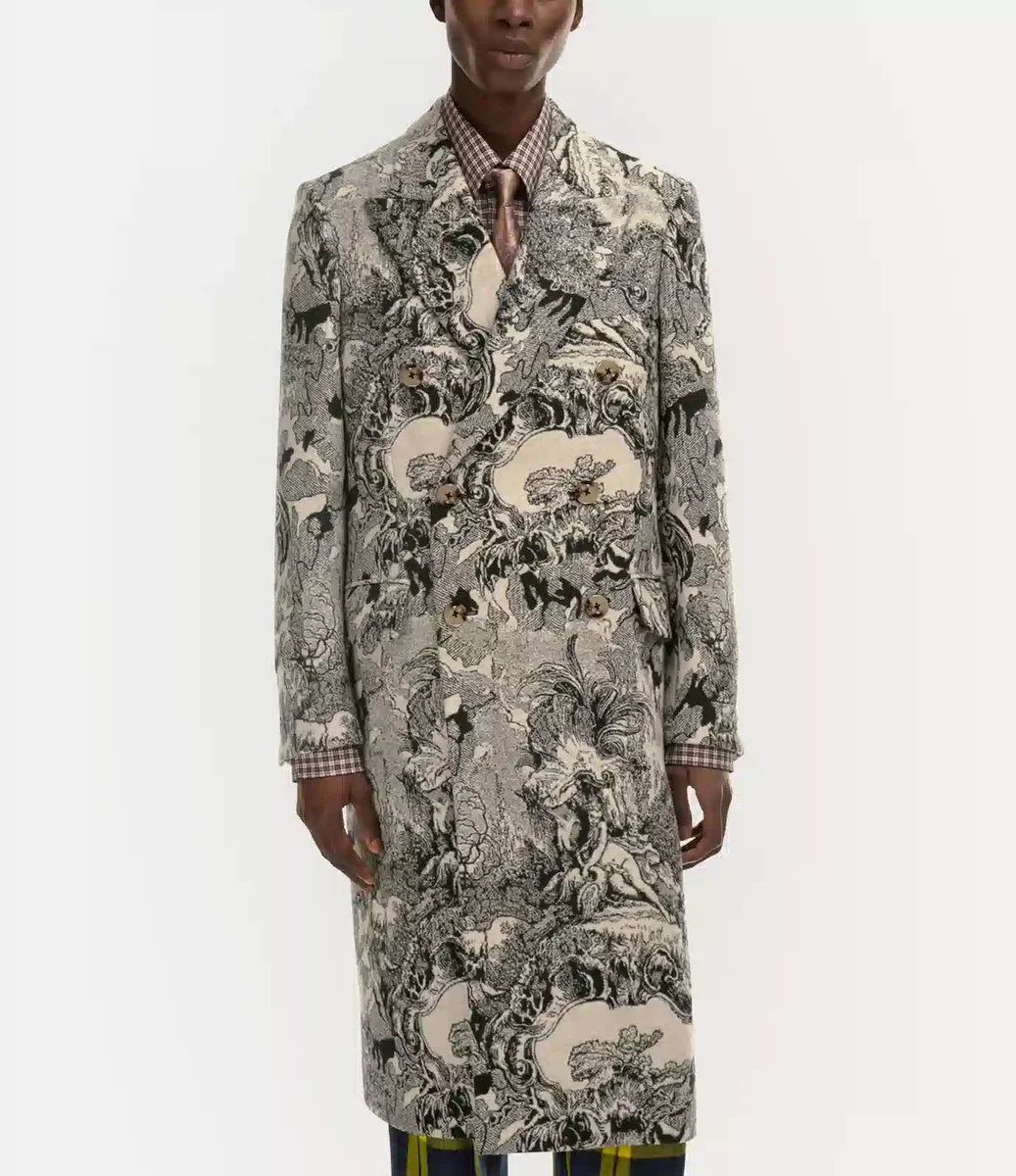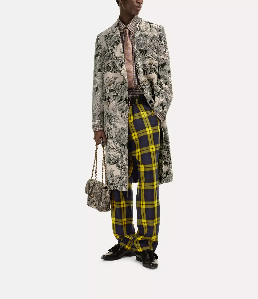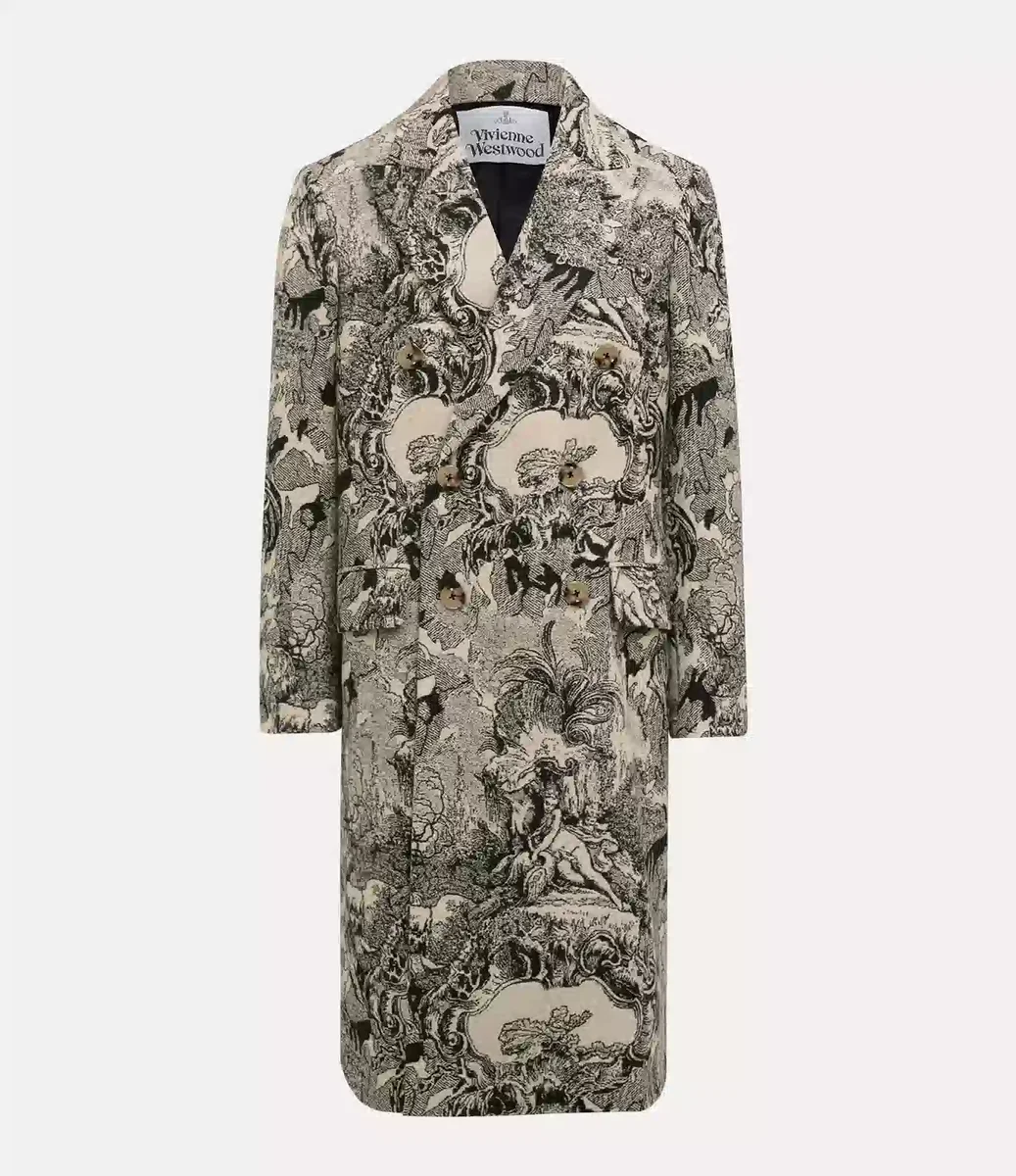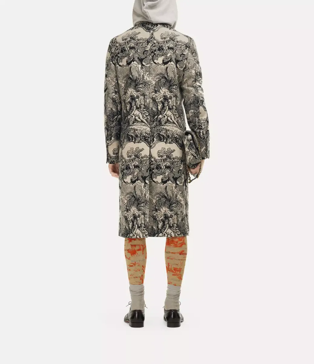 Unser klassischer Zweireihermantel ist aus reichhaltiger gebürsteter Wolle gefertigt und mit dem monochromen Jacquardmuster „Venus” dieser Saison verziert, eine Hommage an Viviennes Bewunderung für die Kunstgeschichte. Das Modell mit strukturierten Schultern und breitem Revers fällt in einer raffinierten knielangen Silhouette.