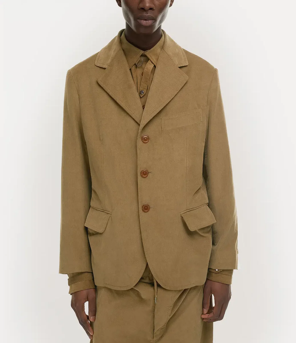 Unsere Wreck Jacke ist ein charakteristisches Modell des Hauses. In dieser Saison wurde das Modell mit einem weichen Baumwoll-Cord-Finish neu interpretiert und mit gravierten Knöpfen auf der Vorderseite versehen. Sie ist an der Taille leicht abgesteppt, um eine konturierte Passform zu erzielen, und mit einem Reverskragen mit Kerbe versehen.