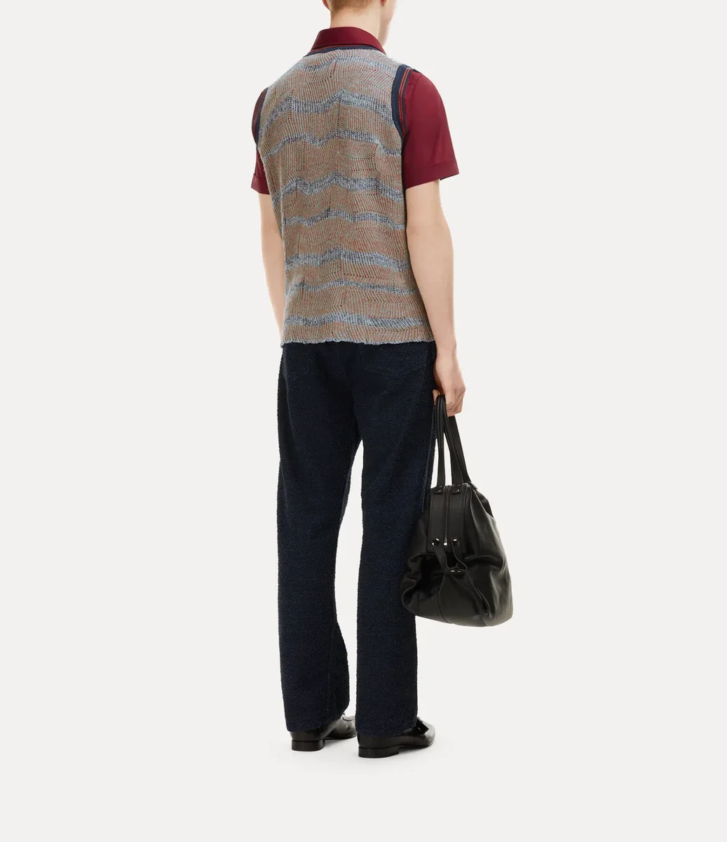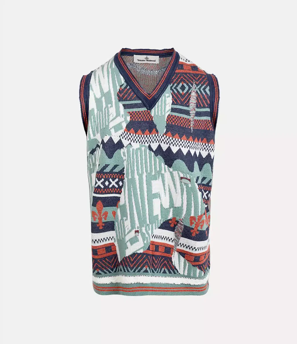 Die Broken Fair Isle Weste präsentiert sich in der Jacquard-Optik dieser Saison und zeigt die charakteristischen Symbole des Hauses sowie verblasste Bereiche, in denen das klassische „Vivienne Westwood”-Schriftzugmotiv dezent zum Vorschein kommt. Das Modell verfügt über Used-Details wie vereinzelte Löcher, die einen dekonstruierten, abgetragenen Effekt erzeugen.
