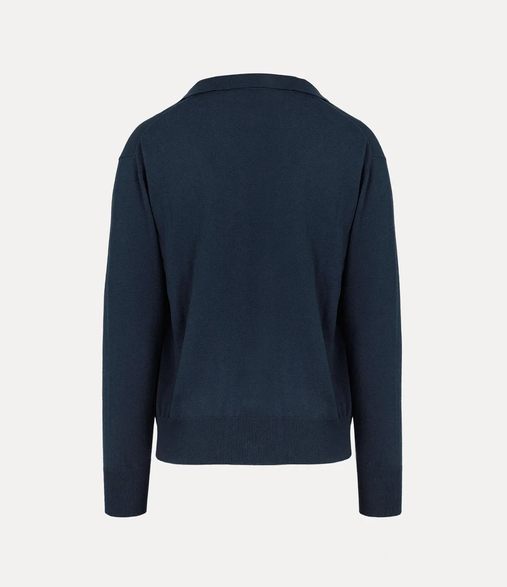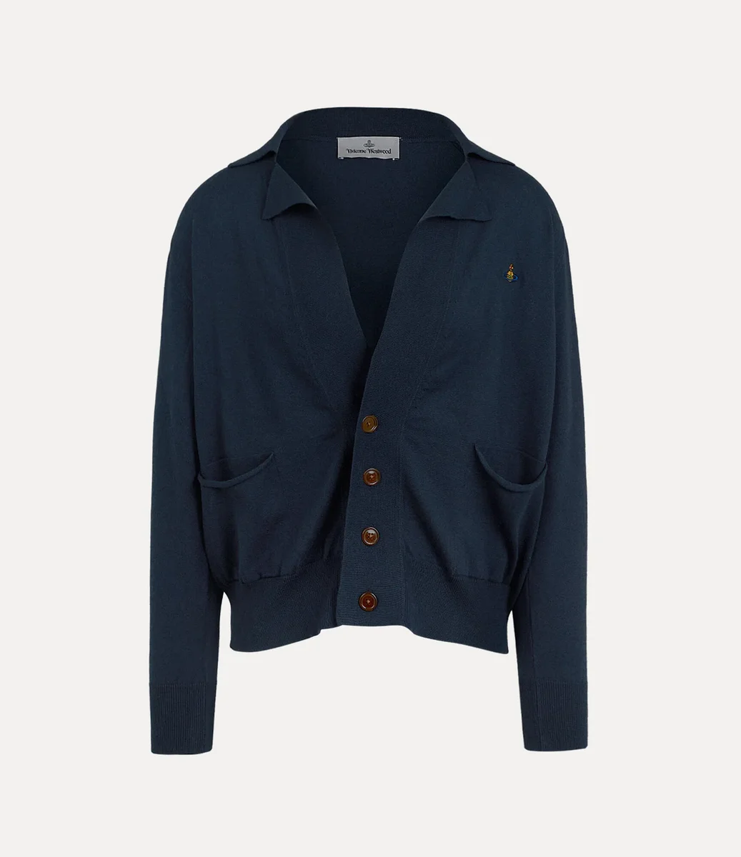 Unser Samuel Cardigan hat einen flachen offenen Kragen und einen V-Ausschnitt, der durch eine Reihe bernsteinfarbener Knöpfe auf der Vorderseite akzentuiert wird. Mit einer gestickten Kugel auf der linken Brustseite verkörpert das Kleidungsstück Viviennes Vision, Tradition in die Zukunft zu tragen.