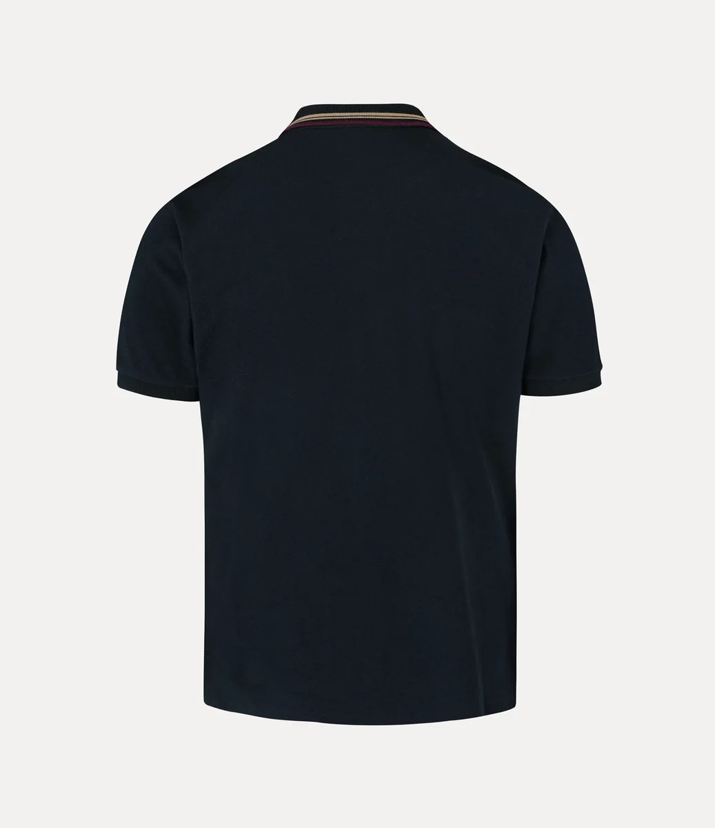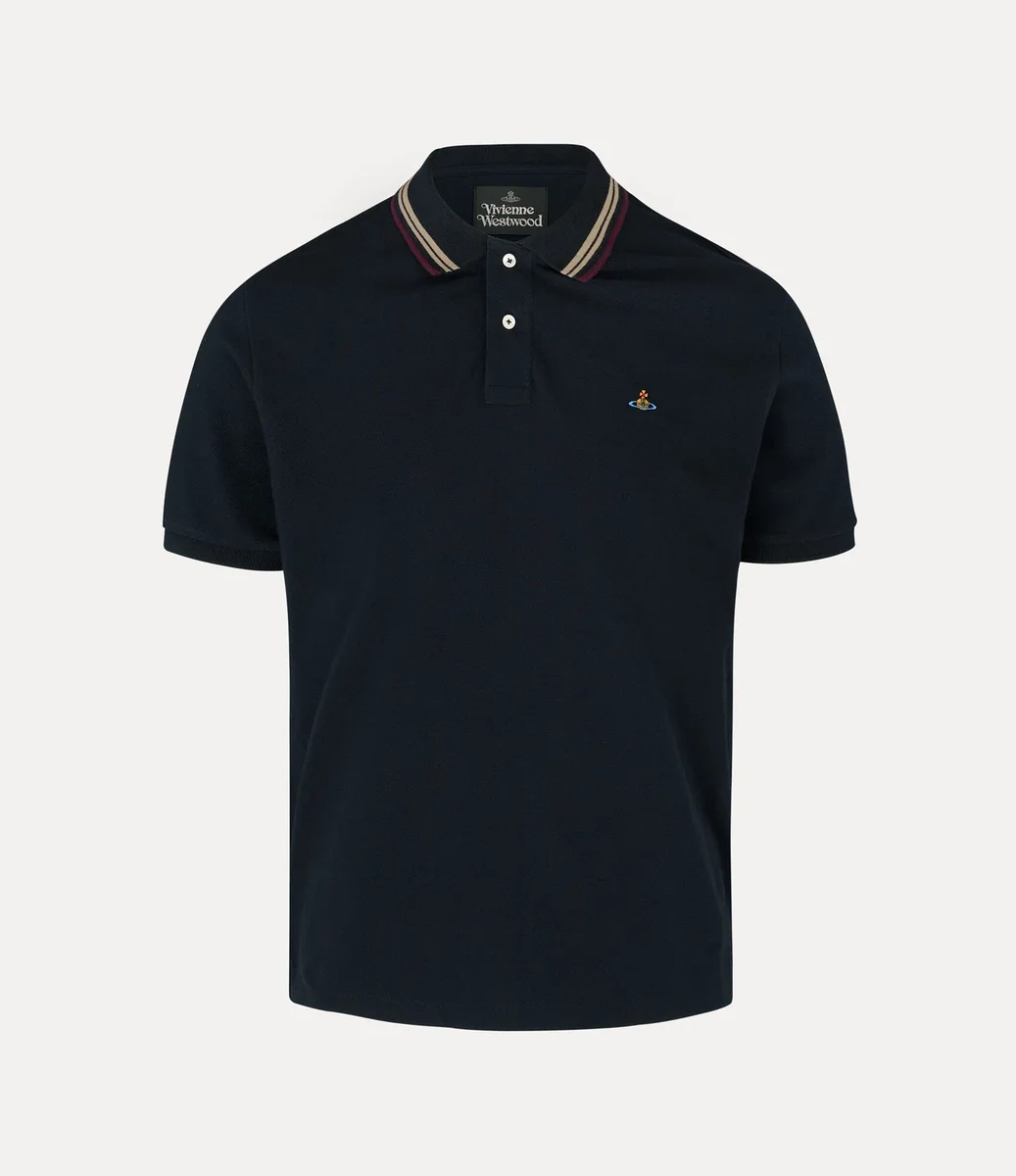 Unser klassisches Polohemd wurde in dieser Saison mit glänzenden Perlmuttknöpfen und gestreiften Details am Kragen neu interpretiert. Das aus weicher Baumwolle gefertigte Kleidungsstück verfügt über ein gesticktes Kugelmotiv auf der linken Brustseite, das Tradition symbolisiert und von den himmlischen Ringen des Saturn umgeben ist, die für die Zukunft stehen.