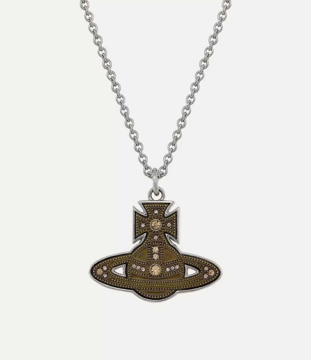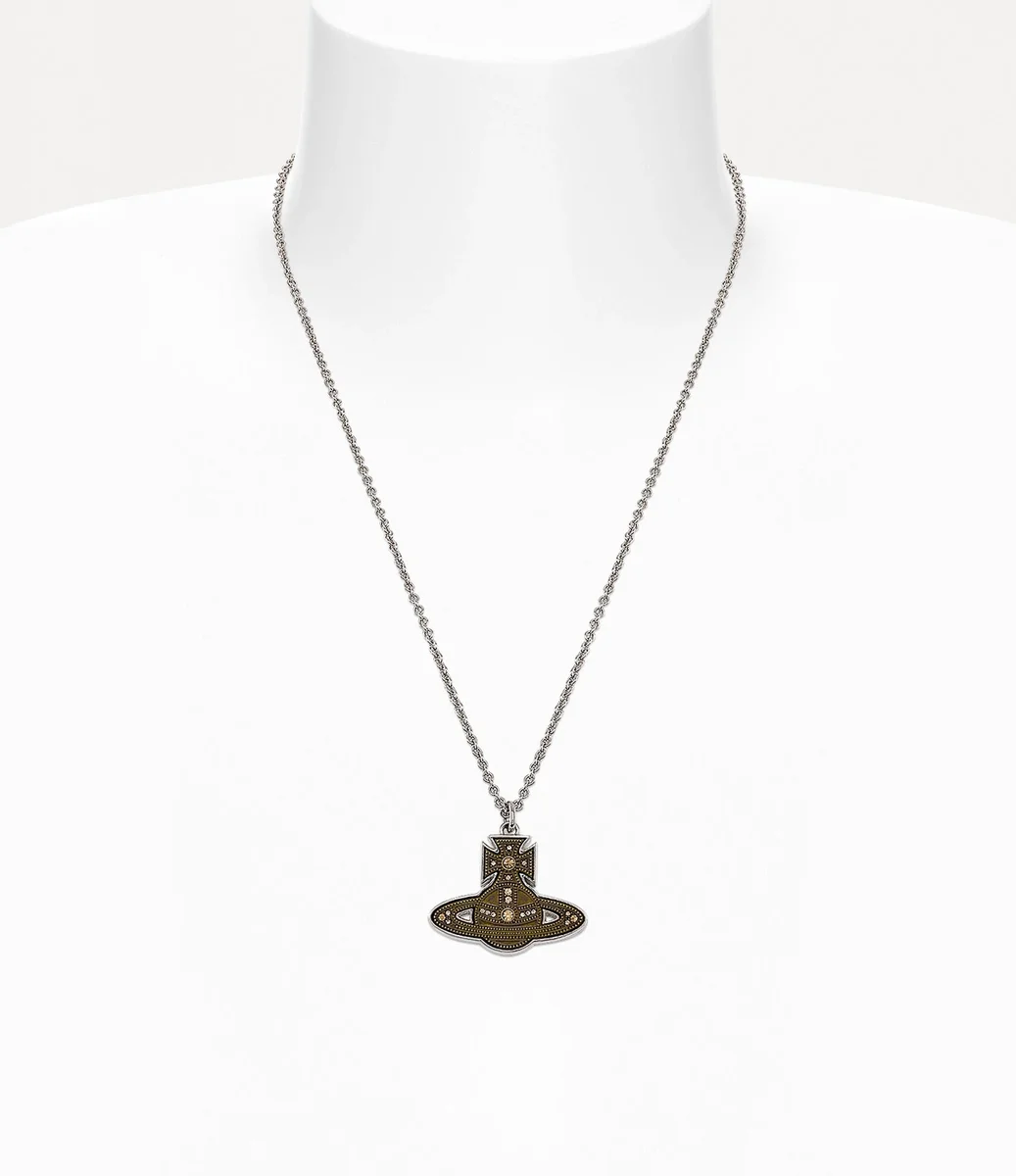 Unsere Man. Laszlo-Anhänger-Halskette hat ein kugelförmiges Motiv in der Mitte des Designs, das mit einer oxidierten Messingoberfläche für einen antiken Look versehen ist. Das Design zeichnet sich durch eine strukturierte Oberfläche aus, die durch Kristalldetails ergänzt wird, die den Saturnring, den Riemen und das Kreuz oben hervorheben.