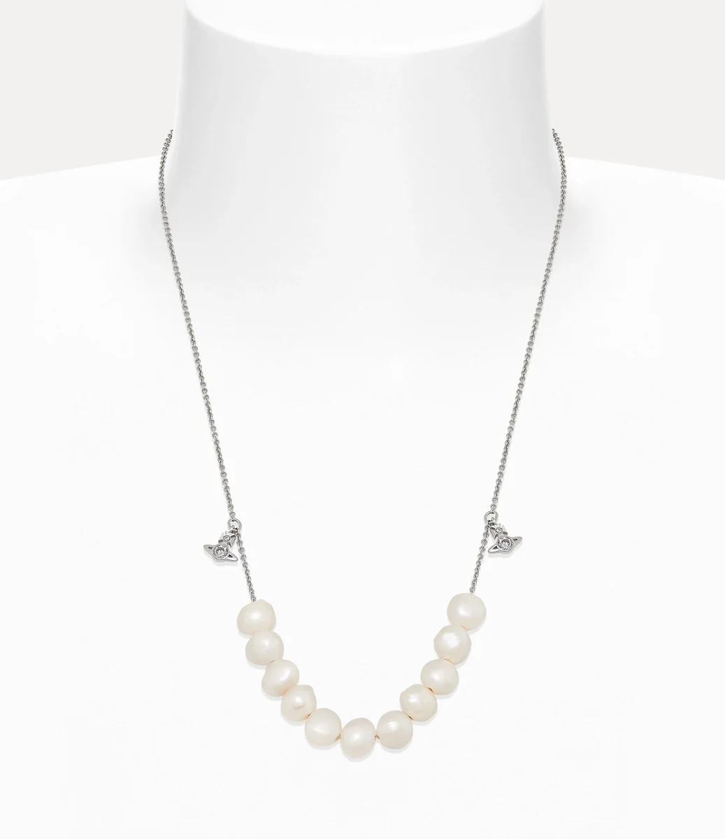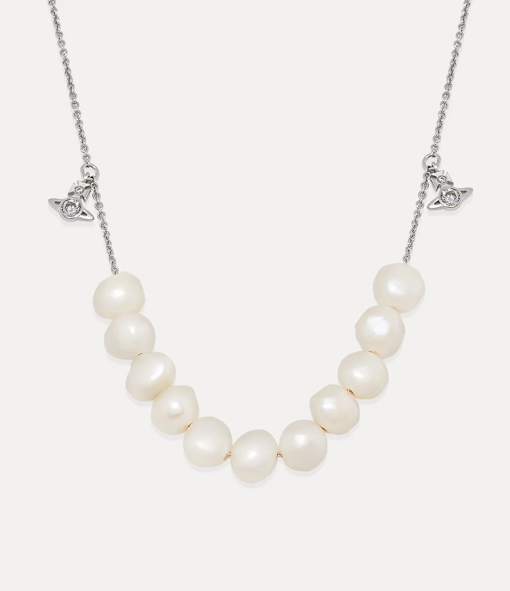 Perlen sind nach wie vor ein wesentliches Element der Ikonografie des Hauses und vermitteln ein Gefühl von vergangenem Luxus. Unsere Man. Azul Halskette besteht aus einer Reihe von Süßwasser-Barockperlen, die an einer Trace-Kette aufgereiht sind, und wird durch zwei baumelnde Kugelmotive auf beiden Seiten des Designs abgerundet.