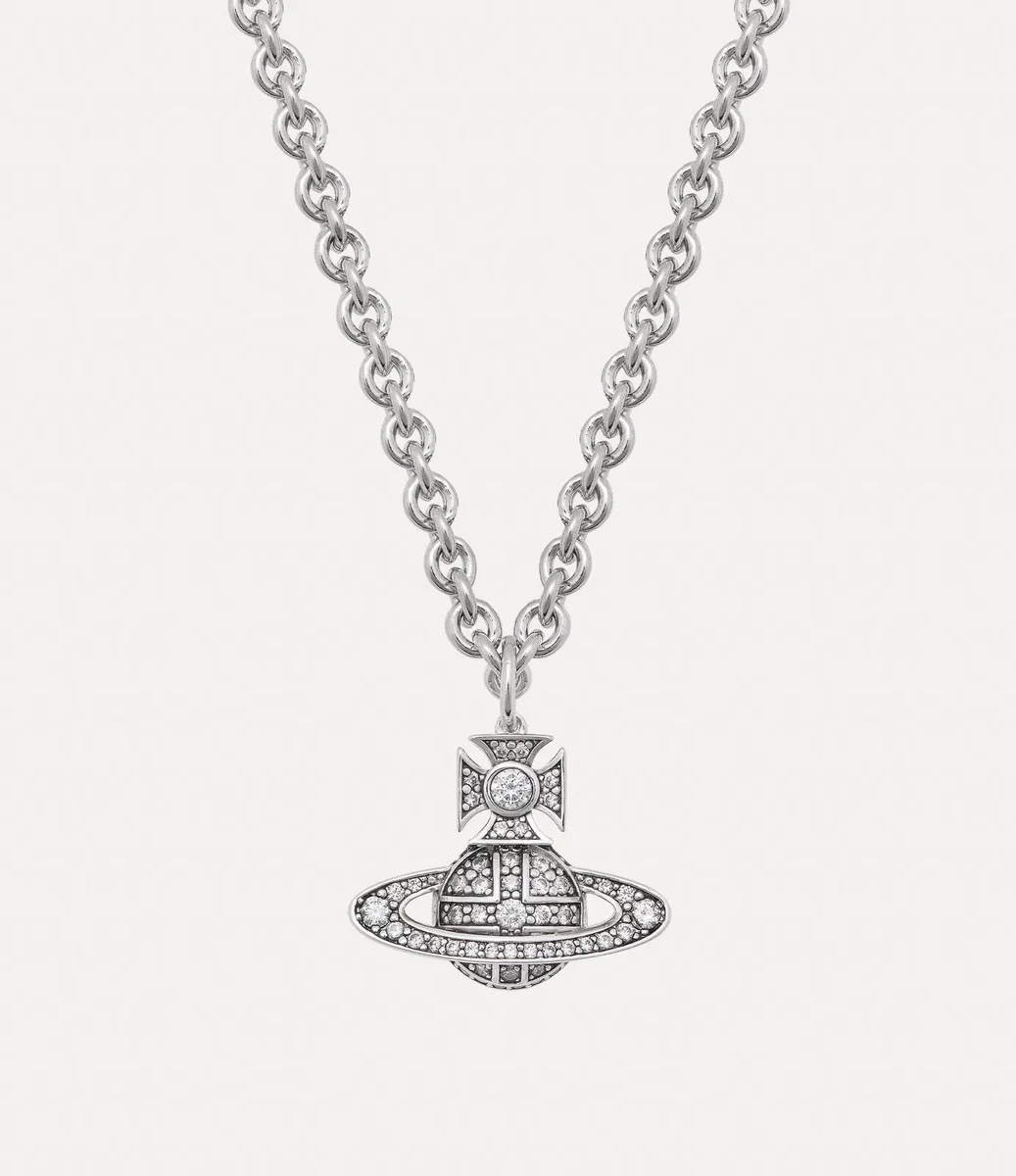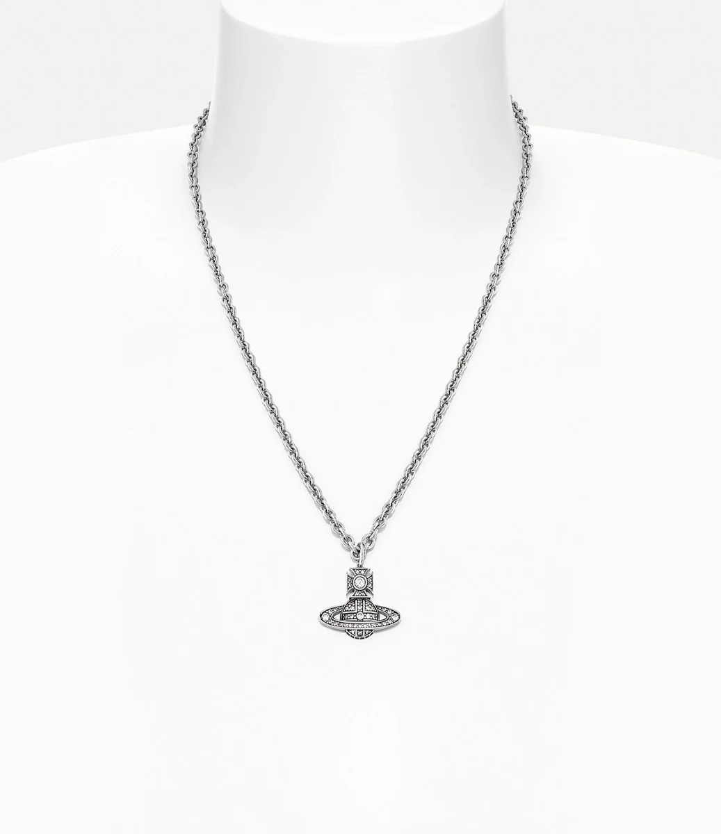 Inspiriert von Viviennes Vision, Tradition in die Zukunft zu tragen, zeigt die Silhouette der Man. Carmela Bas Relief Pendant Halskette unser charakteristisches zweidimensionales Kugelmotiv in der Mitte der klobigen Gliederkette. Das Stück verfügt über glitzernde Kristalldetails in der zentralen Kugel und im Saturnring, ergänzt durch eine polierte, silberfarbene Beschichtung.
