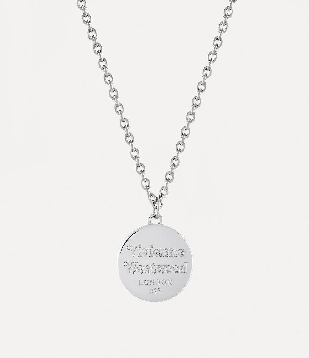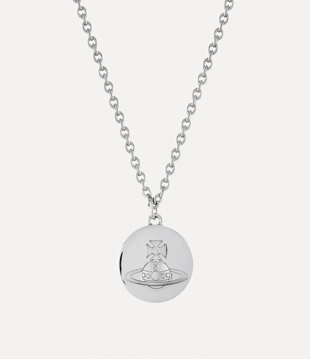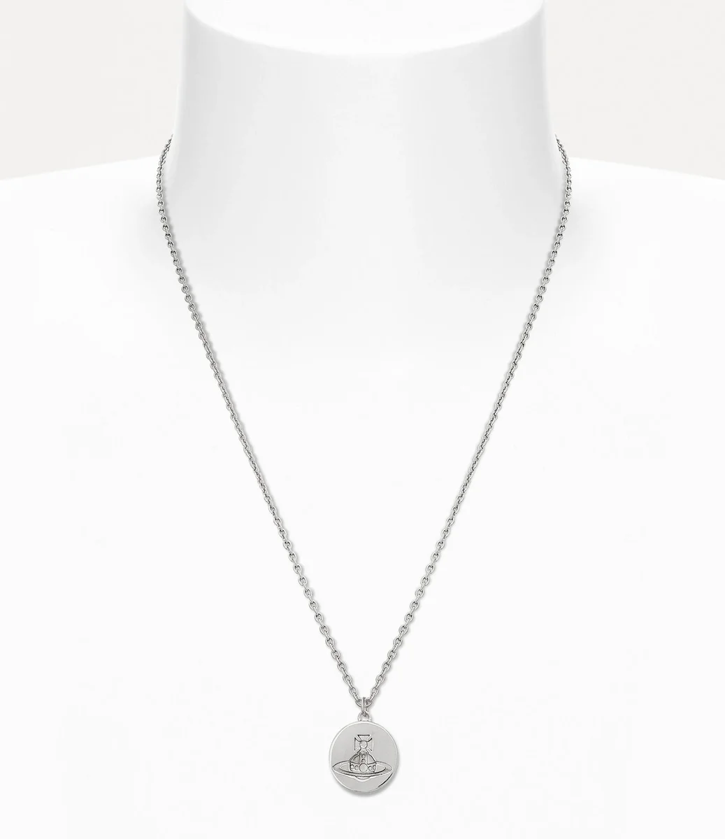 Die Man. Janus Pendants Halskette verfügt über eine platinbeschichtete Silberoberfläche und ist zu einer filigranen ovalen Silhouette geformt. Das Schmuckstück ist komplett aus Metall gefertigt und mit einem gravierten Schriftzug auf der Rückseite versehen, während die Vorderseite mit einem geprägten Globus verziert ist – ein Symbol für die Philosophie des Hauses, die Vergangenheit mit der Zukunft zu verbinden.
