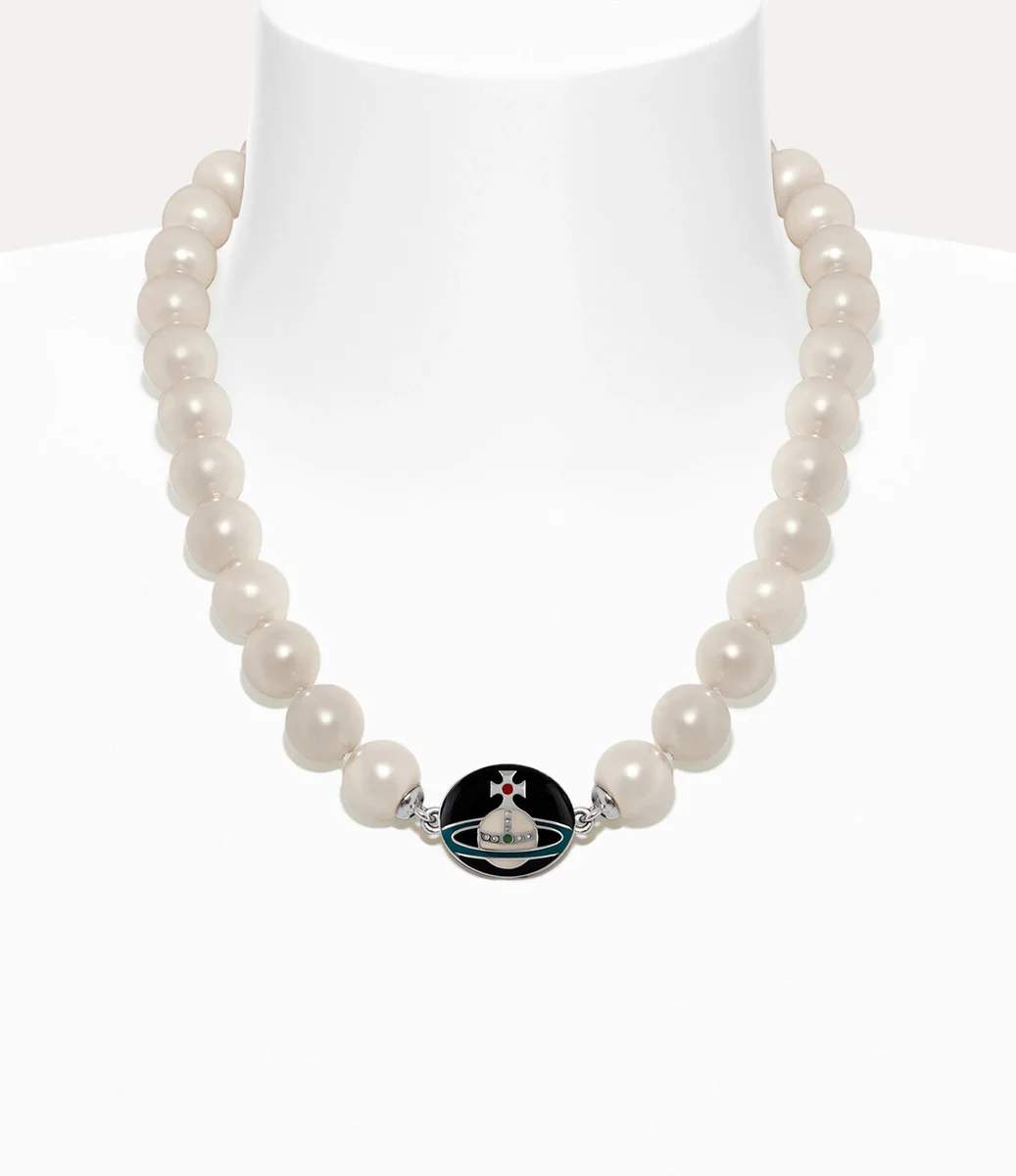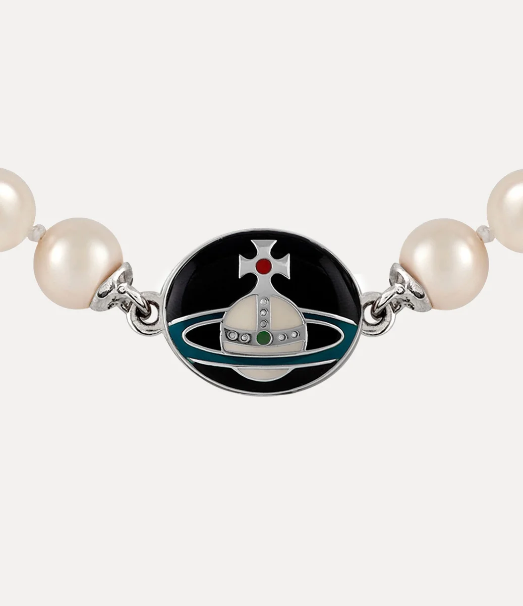 Das charakteristische Kugelmotiv des Hauses steht für Viviennes Vision, Tradition in die Zukunft zu tragen. Unsere Man. Loelia Large Pearl Halskette bietet eine neu interpretierte Version der Kugel, die in der Mitte des ovalen, knopfförmigen Verschlusses platziert ist und mit handgemalten Emaille-Details verziert ist.