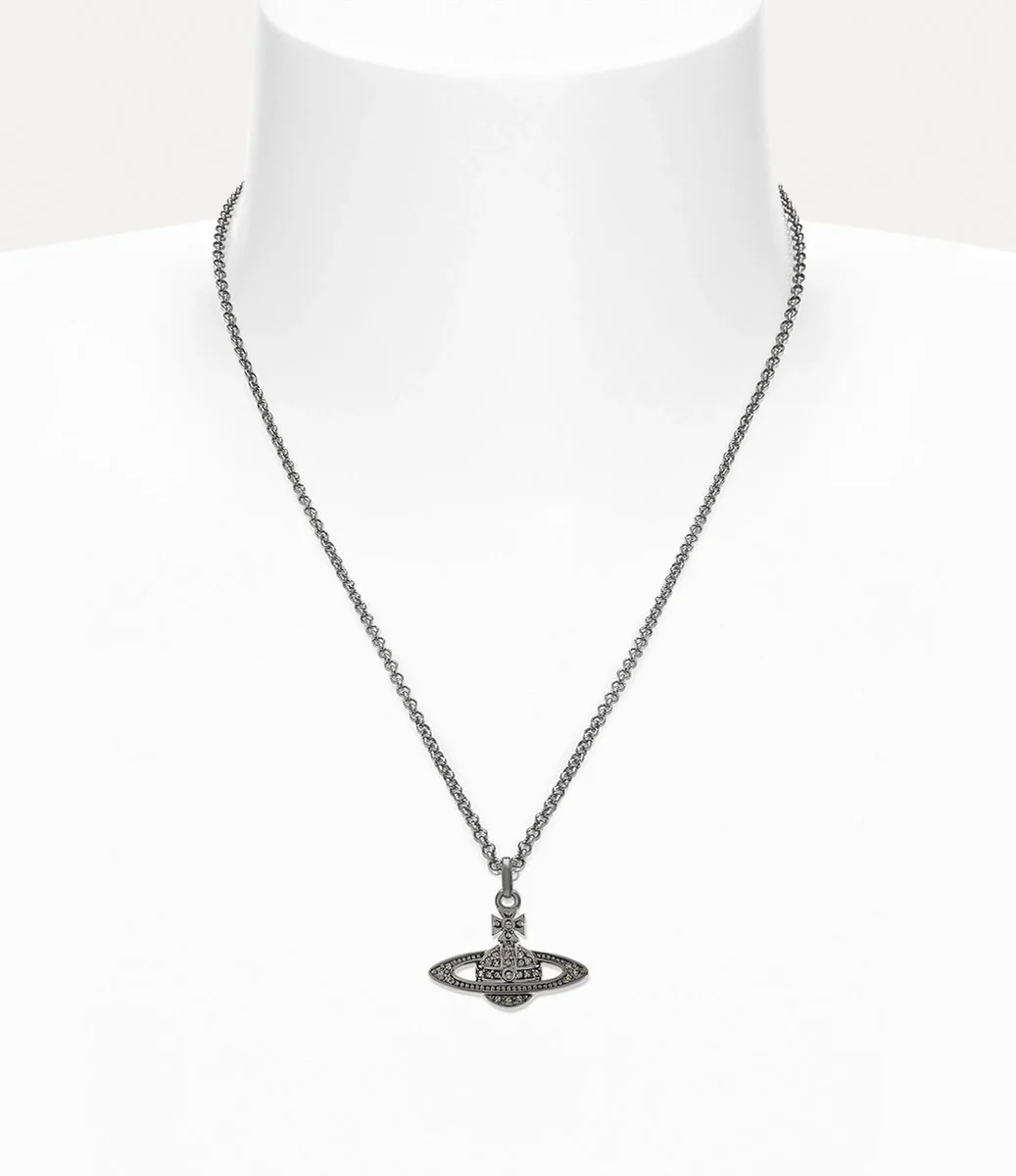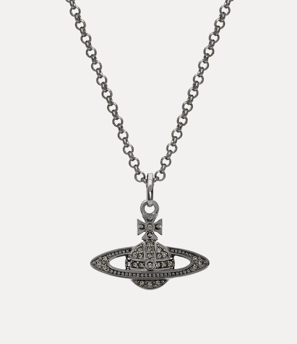 Die Kugelform des Hauses steht für Viviennes Vision, Tradition in die Zukunft zu tragen. Die Man. Mini Bas Relief Orb Pendel Halskette hat die Form einer Kugel und ist mit schwarzen Kristalldetails und einer gunmetal-farbenen Beschichtung verziert.