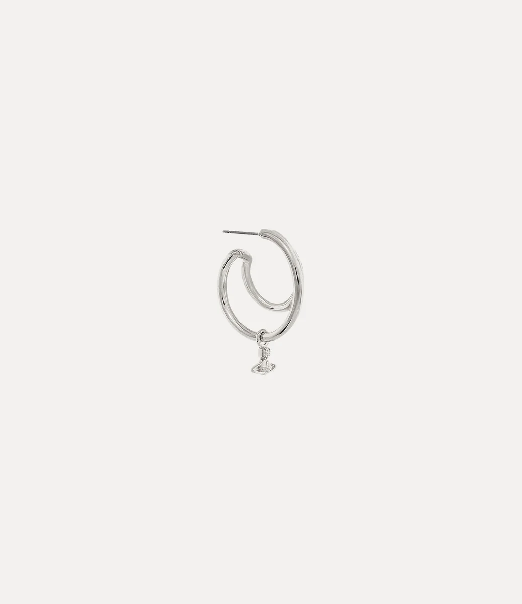 Der Man. Ronda Single Ohrring zeichnet sich durch die in dieser Saison angesagte Doppelring-Silhouette aus, die den Eindruck mehrerer Piercings erweckt. Das Modell hat eine polierte, silberfarbene Oberfläche und wird durch ein baumelndes Kugelmotiv ergänzt, das elegant zwischen den Ringen sitzt.