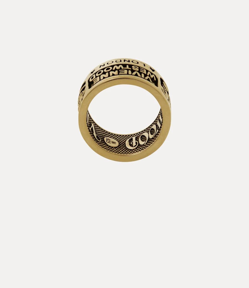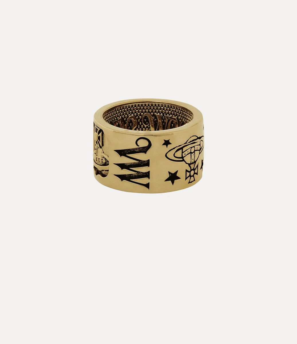 Der Lancelot-Ring aus goldfarbenem, recyceltem Silber ist mit charakteristischen Sprüchen und Motiven verziert, die von der Geschichte des Hauses inspiriert sind. Das breite Statement-Band ist mit Details im Antik-Look versehen, während das Innenband eine geprägte „Vivienne Westwood”-Inschrift in der charakteristischen Schriftart aufweist.