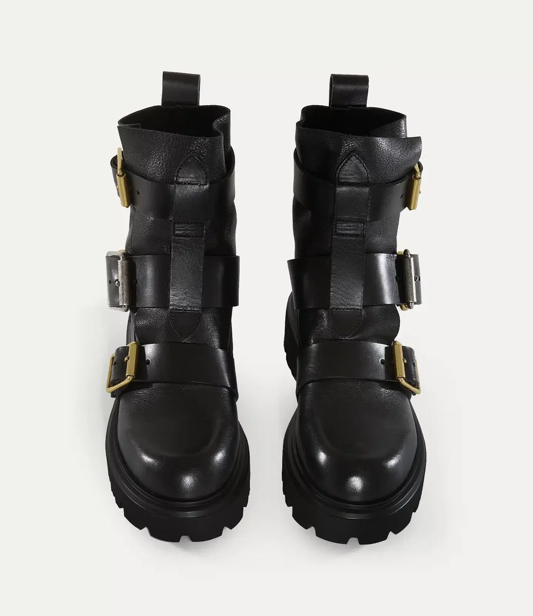Die Empire-Stiefel sind von den Seditionary-Stiefeln aus dem Archiv inspiriert, die erstmals in der Herbst/Winter-Kollektion 1983 des Hauses vorgestellt wurden. Das Design zeichnet sich durch ein geöltes Lederfinish aus und ist mit Lederriemen und Rollschnallen verziert, die an Themen wie Einschränkung und Kontrolle erinnern, die von Bondage- und Fetischkleidung inspiriert sind.